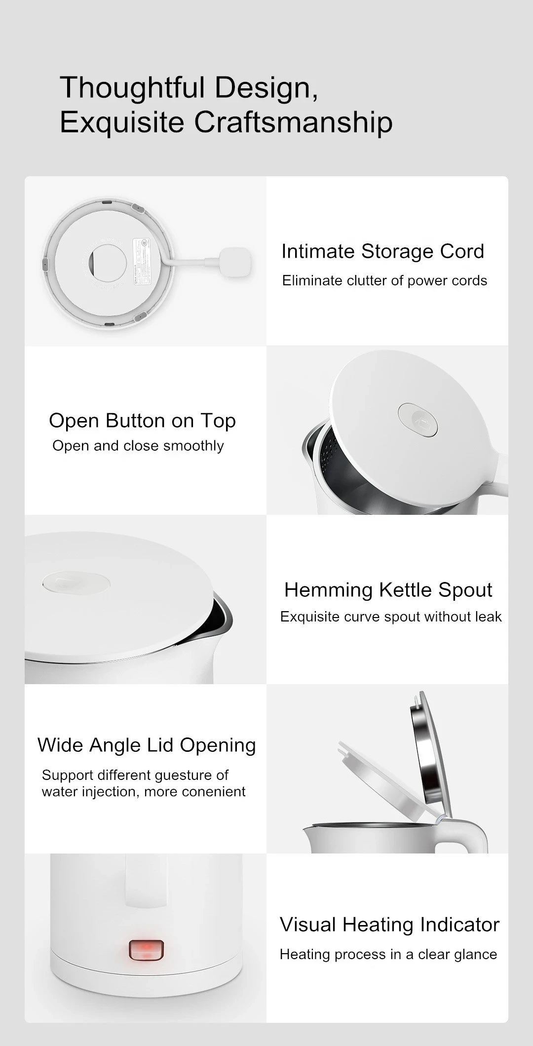 ● Высокая мощность 1800 Вт, быстрое кипячение ● Двухслойная структура внутри и снаружи, которая является Полой и не горячей ● Термостат британского бренда для обеспечения полной варки горячей воды ● Конструкция большого размера для более легкой очистки ● Автоматическое выключение после кипения, автоматическое выключение при недостатке воды, разъем питания для предотвращения электрического удара, автоматическое отключение при поднятии горшка, чтобы предотвратить пустое горение