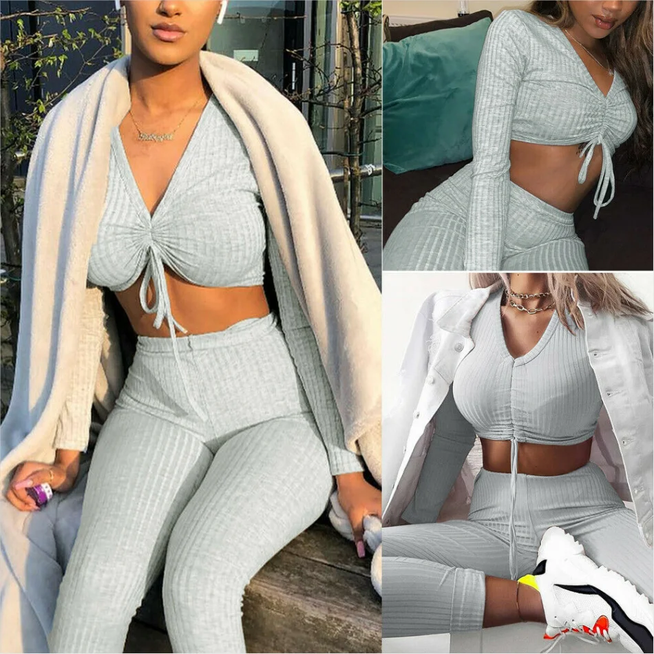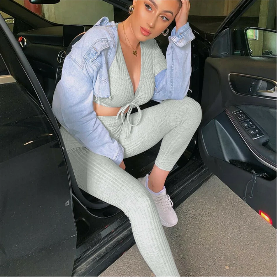 Комплект женский трикотажный из двух предметов, с коротким топом, однотонный серый, S-L