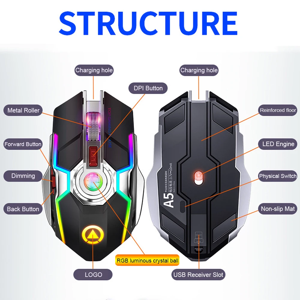 A5 бесшумный Перезаряжаемые игровой Мышь Беспроводной Мышь стример ...