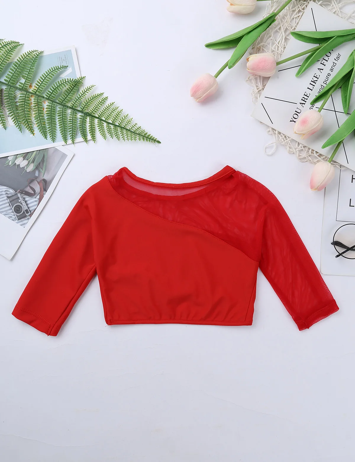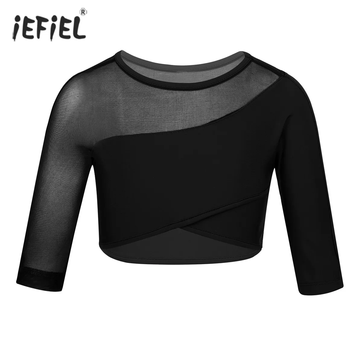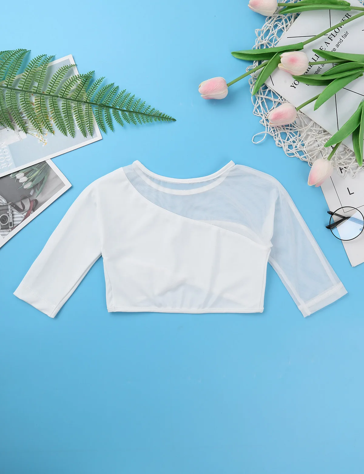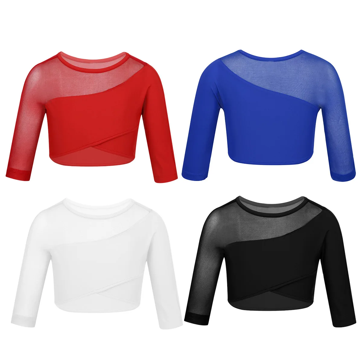 Детские укороченные топы для балета и танцев для девочек, асимметричные сетчатые майки с рукавом 34 для выступлений, тренировок, гимнастики, танцев