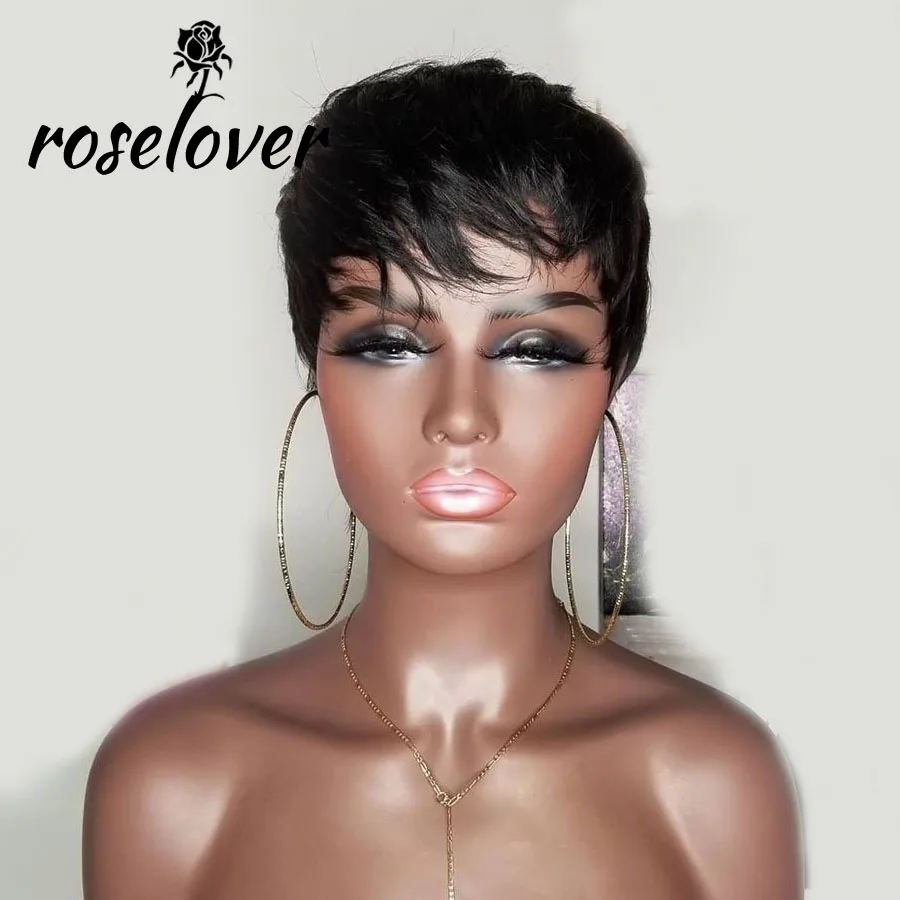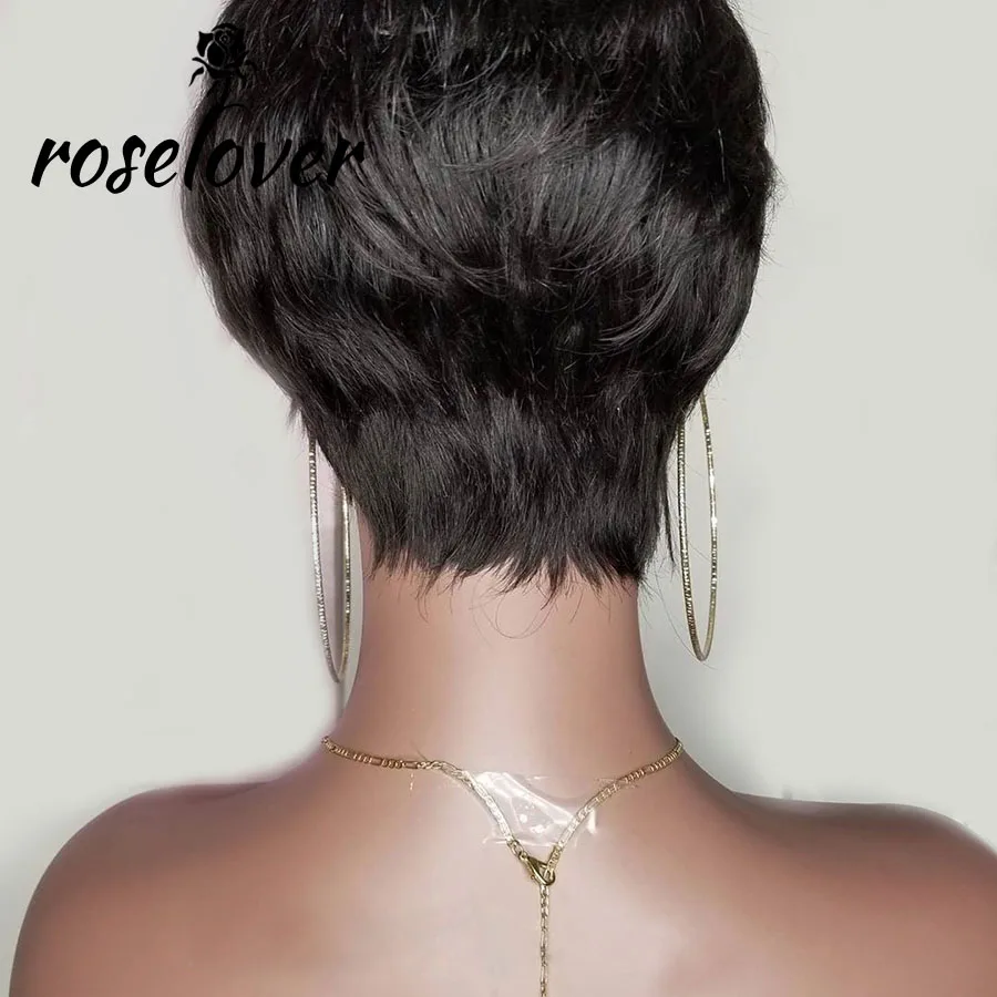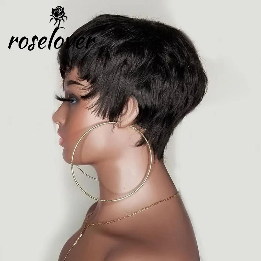 ROSELOVER 150% парики с высоким коэффициентом вырезания Фея естественный черный цвет короткие человеческие волосы без клея бразильские волосы Remy парики полная машина
