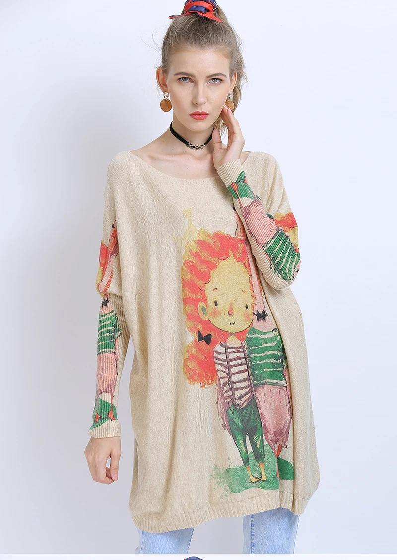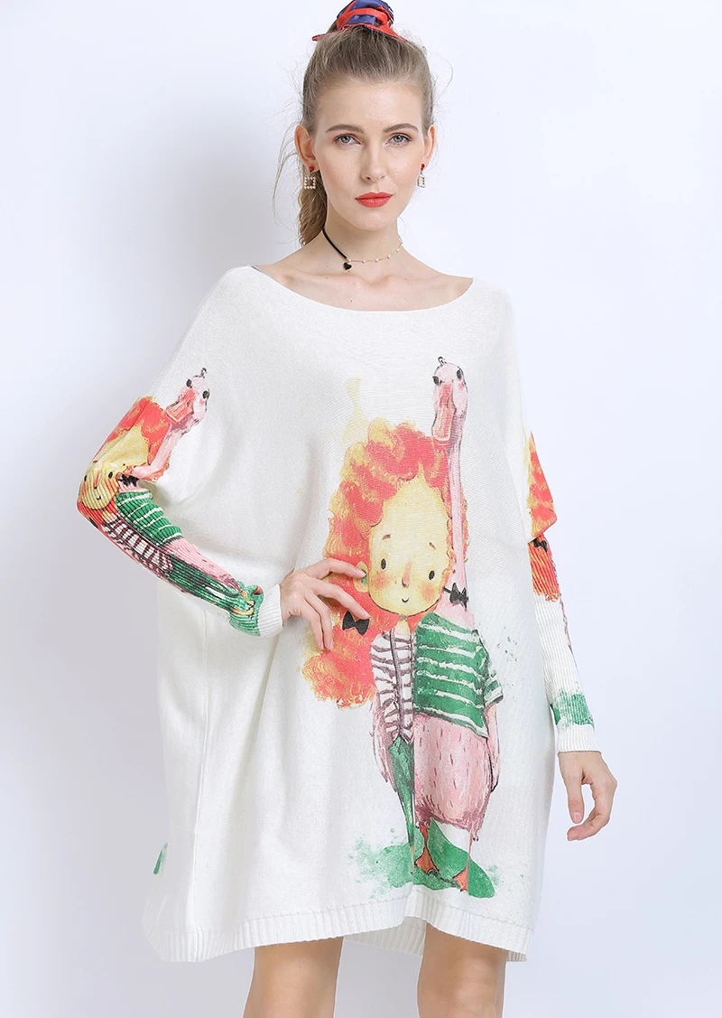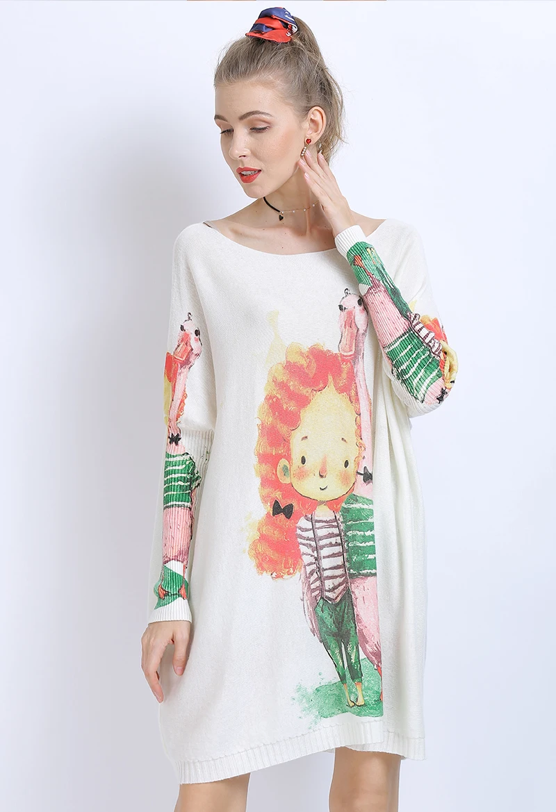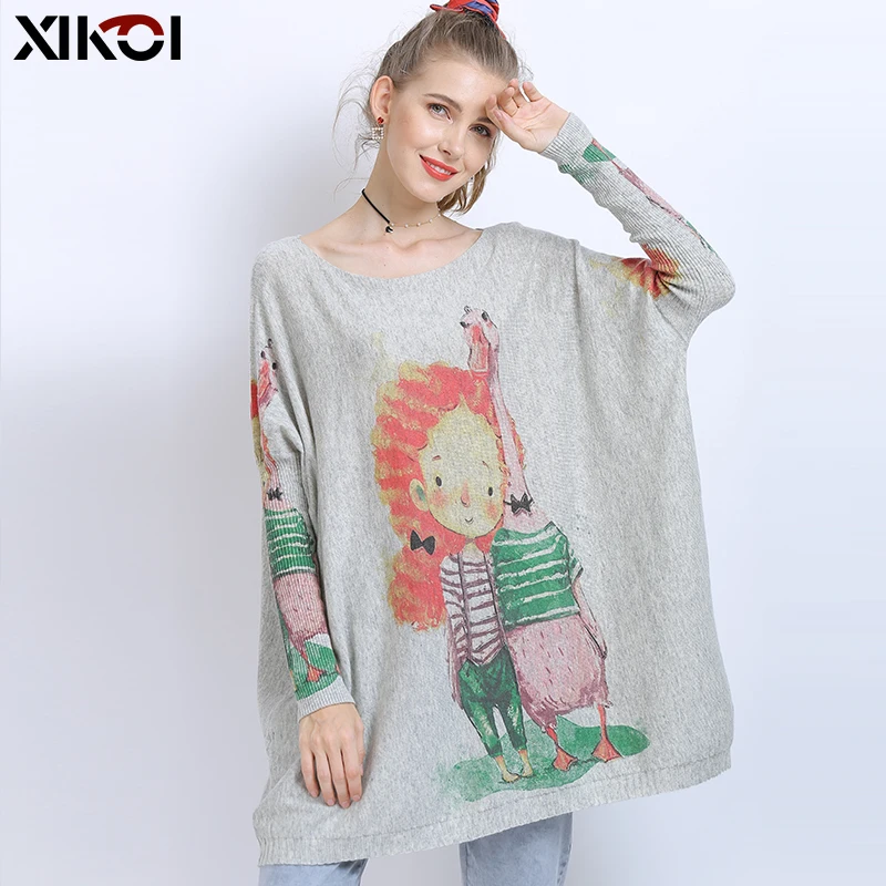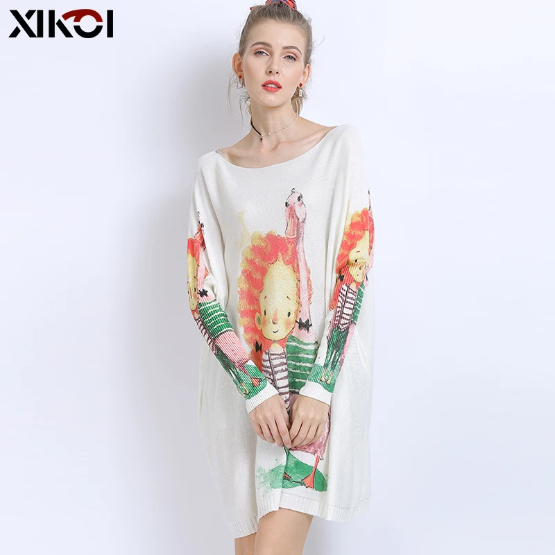 XIKOIзимние свитера больших размеров для женщин, теплые длинные пуловеры, платья, Милый джемпер с принтом для девочек, Повседневные вязаные свитера, Pull Femme