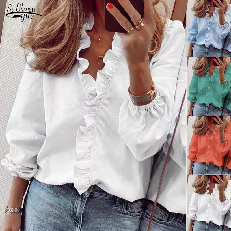 Новинка размера плюс, 4XL, 5XL, осенняя шифоновая женская рубашка с оборками, блузки с цветочным рисунком и длинным рукавом, женская белая одежда, блузы 18246