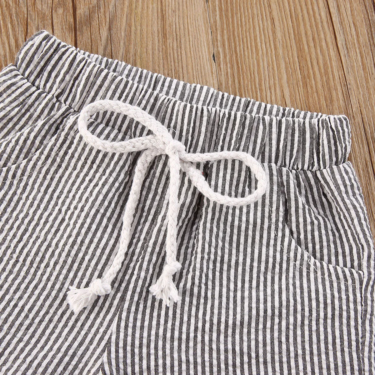 Летний повседневный костюм для маленьких мальчиков и девочек, белая хлопковая льняная футболка с пуговицами, полосатые штаны, комплект из 2 предметов для младенцев