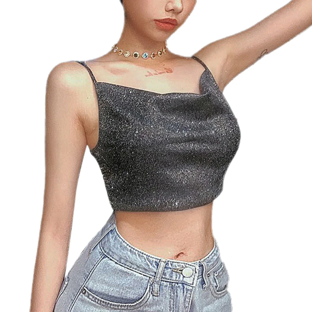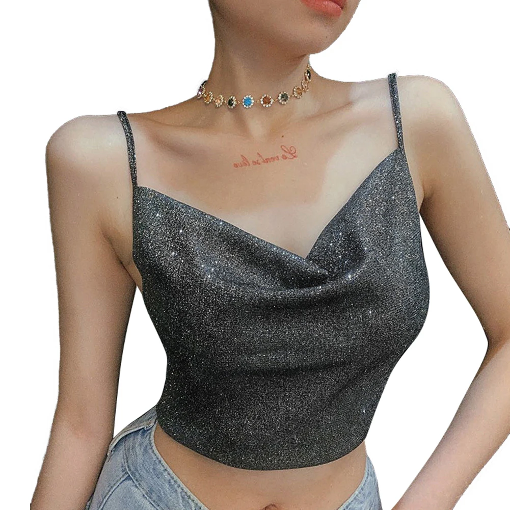Сексуальный серебряный блестящий топ с драпировкой на шее, женский летний топ с открытой спиной и топ с бретельками