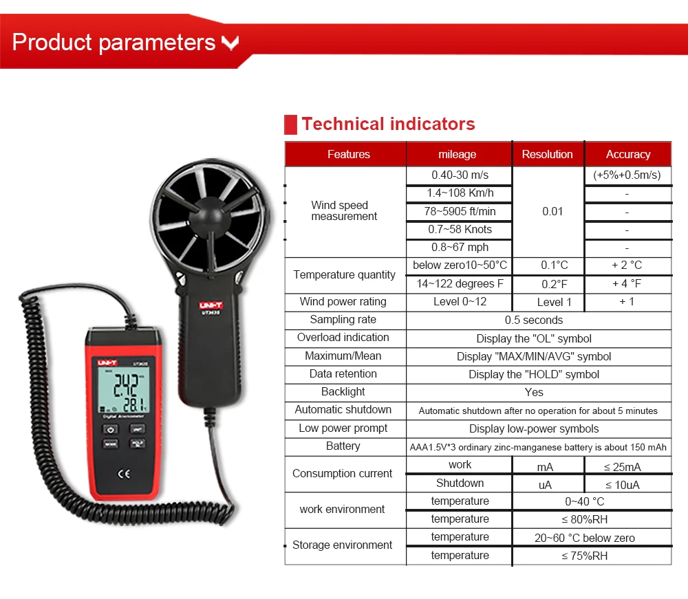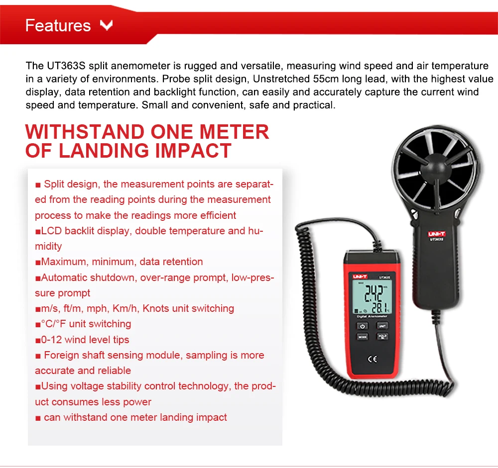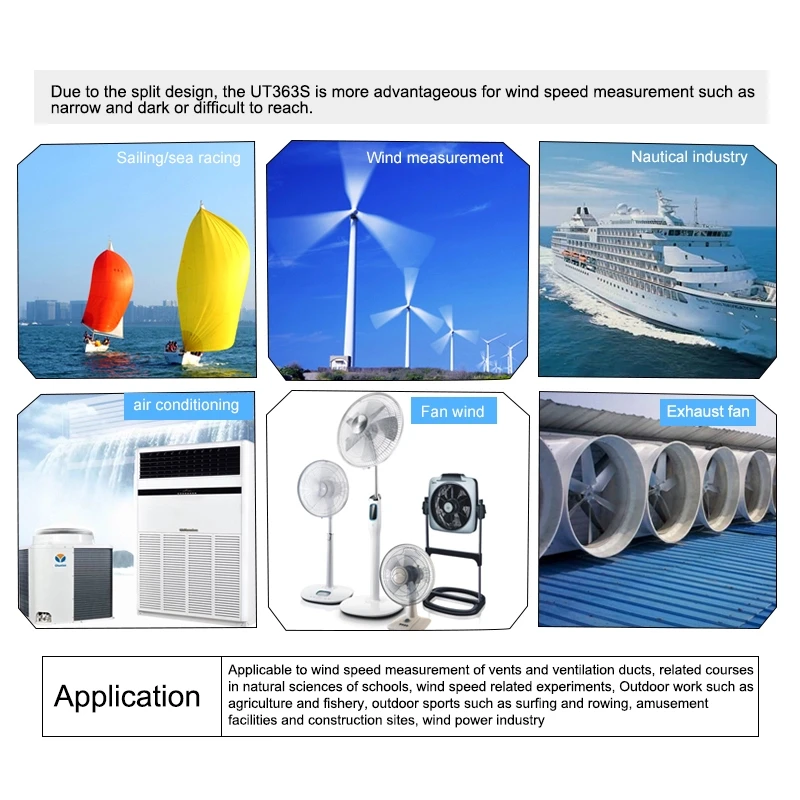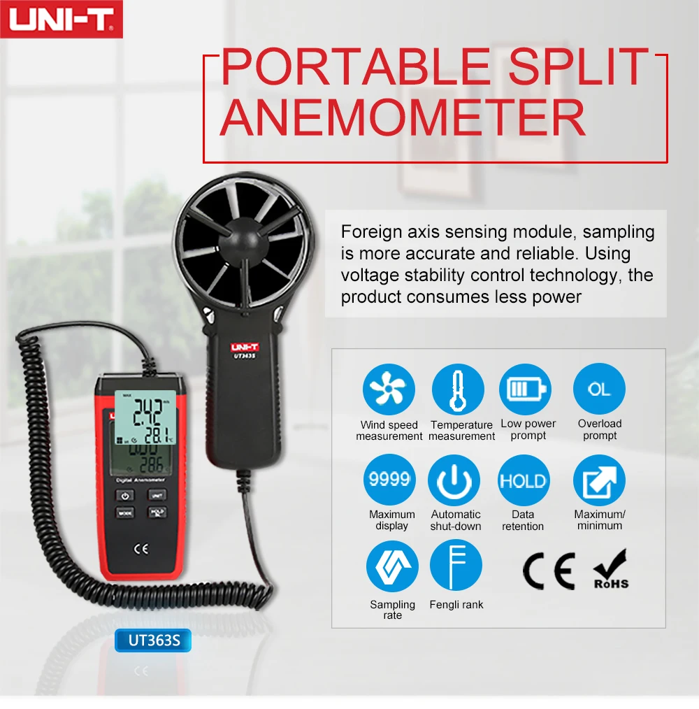 UT363S-это стабильный, безопасный и надежный Анемометр сплит-типа, обеспечивающий быстрое обнаружение, низкое потребление и высокую точность.