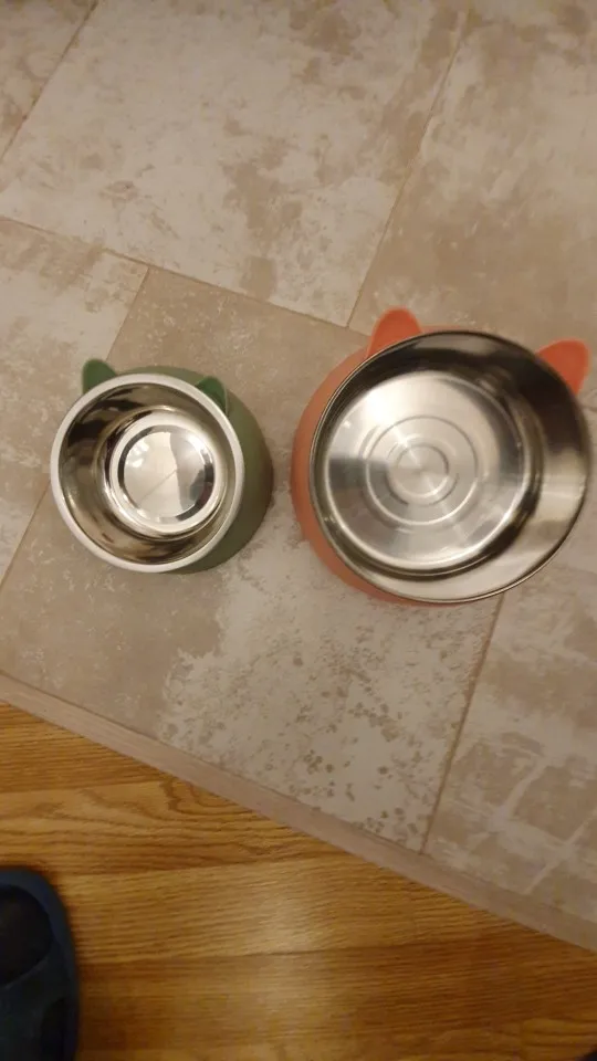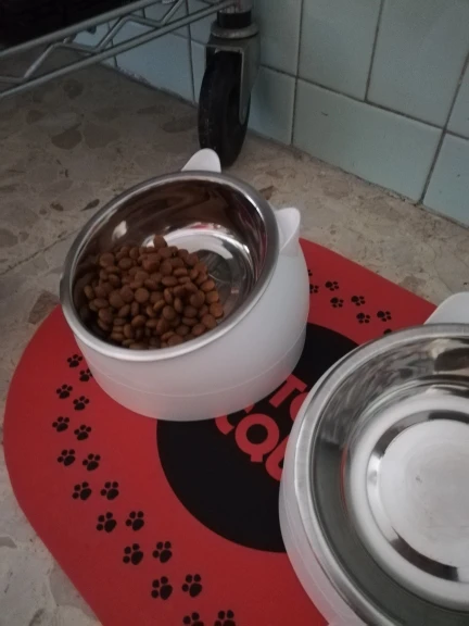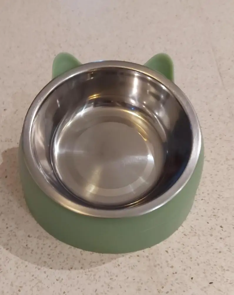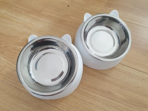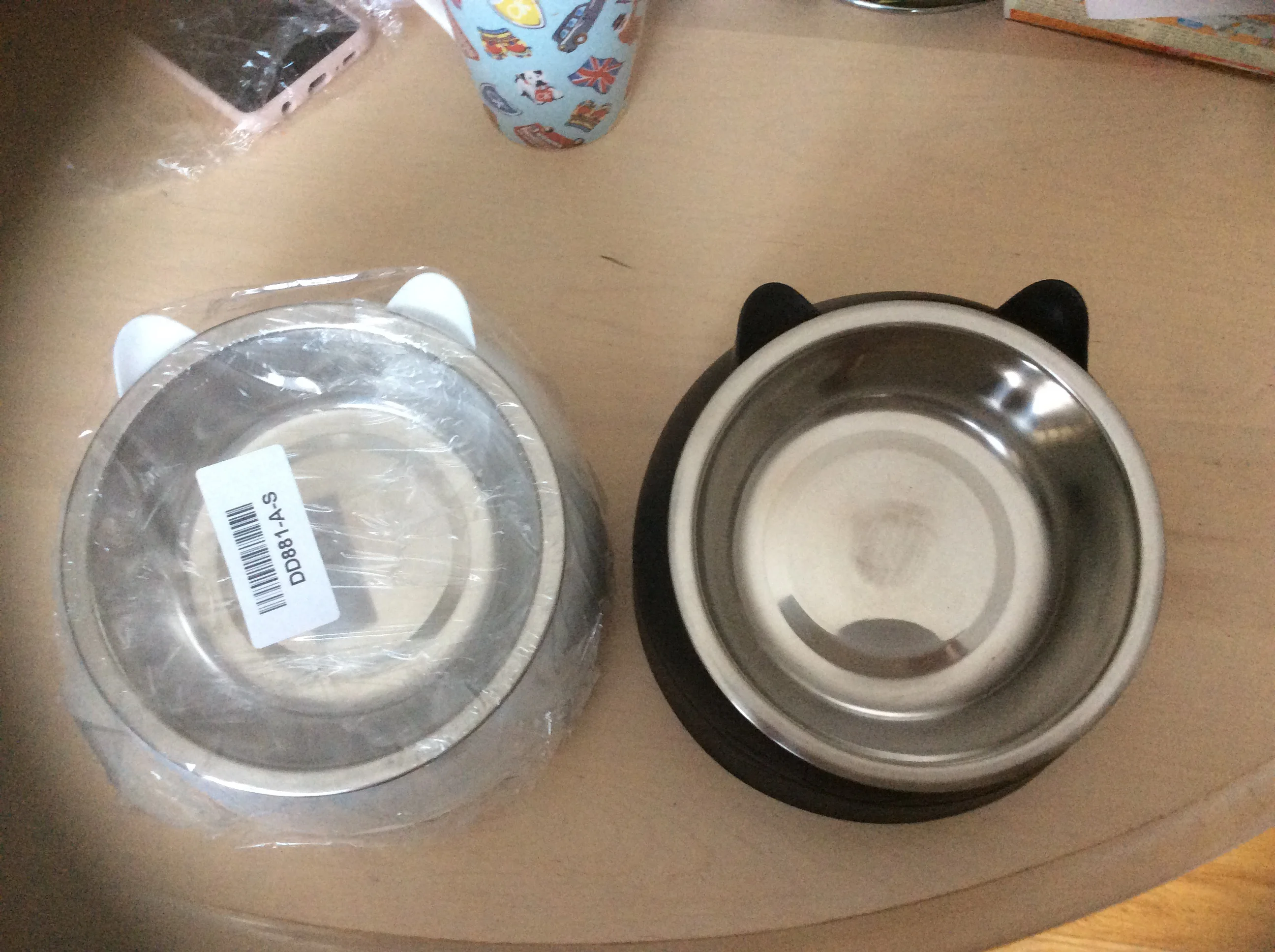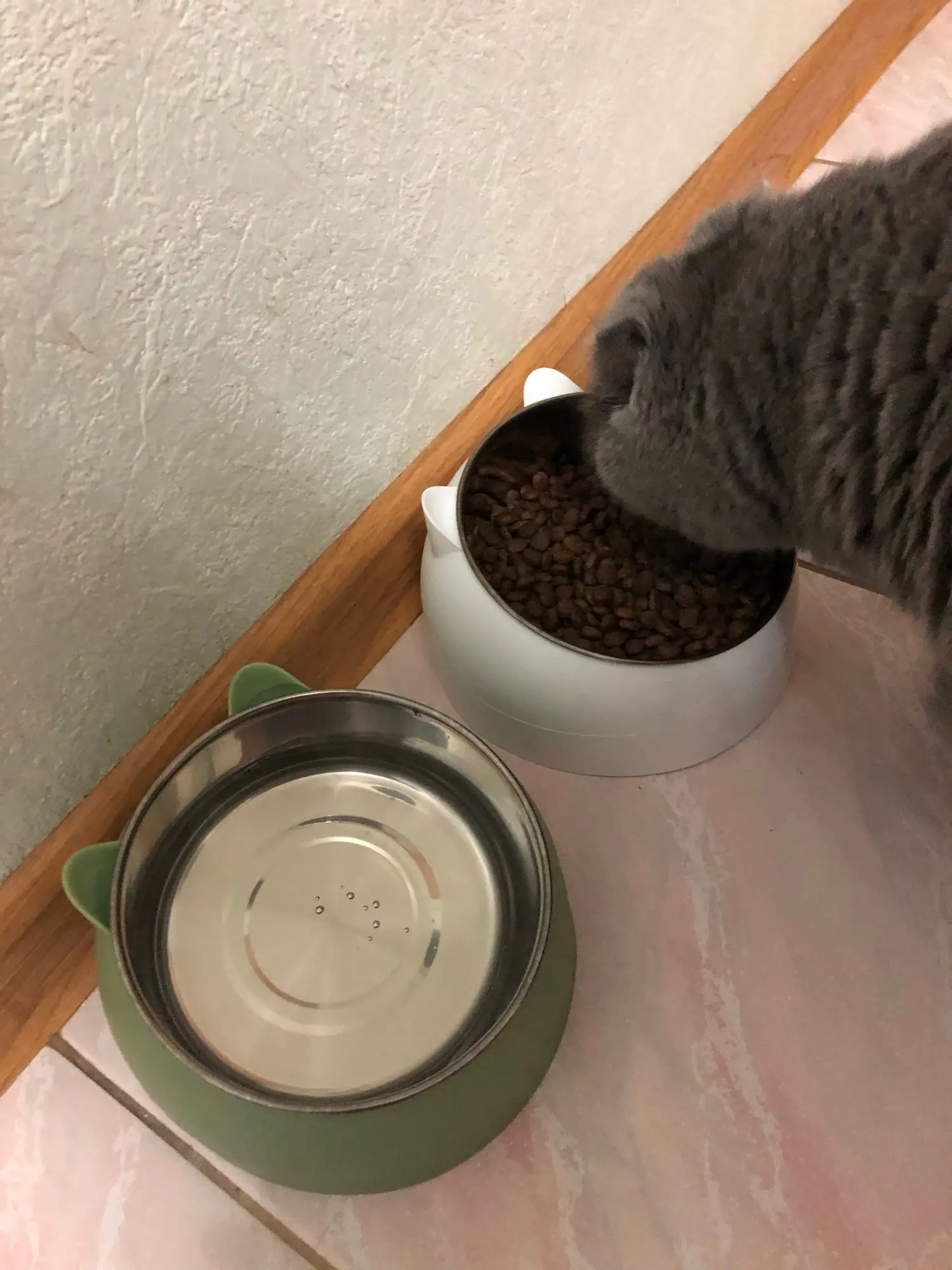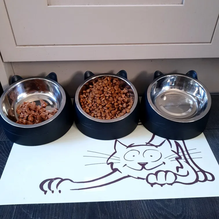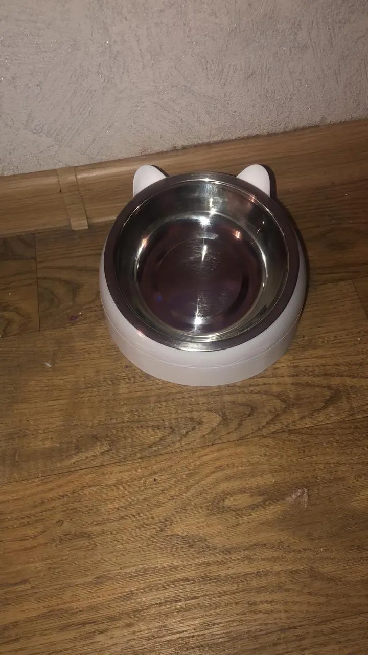 К сожалению, одна миска пришла немного треснутой, пришлась клеить. Неудобно наливать воду, так как из-за сильного наклона вода выдувается. Только на самое донышко выходит налить