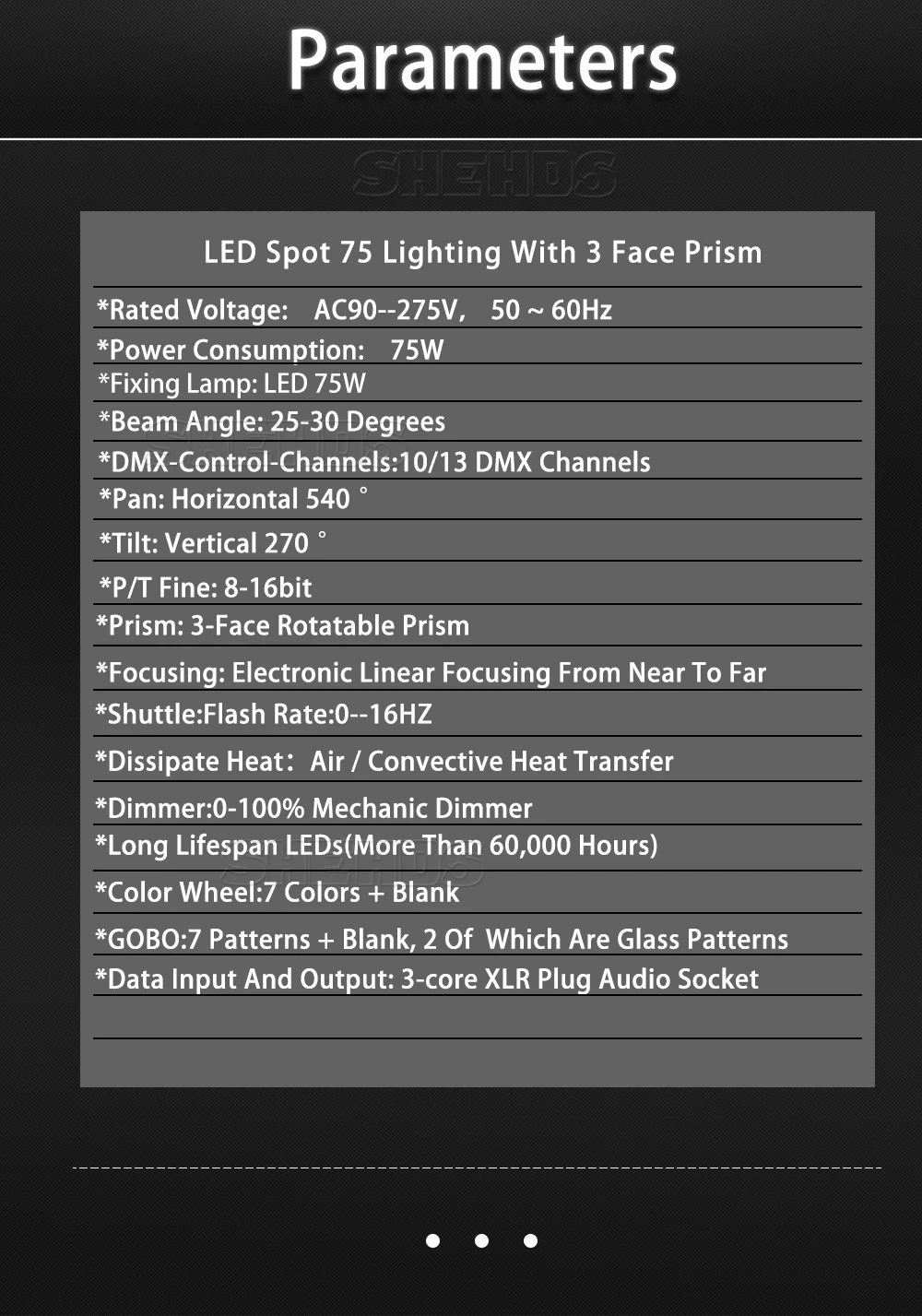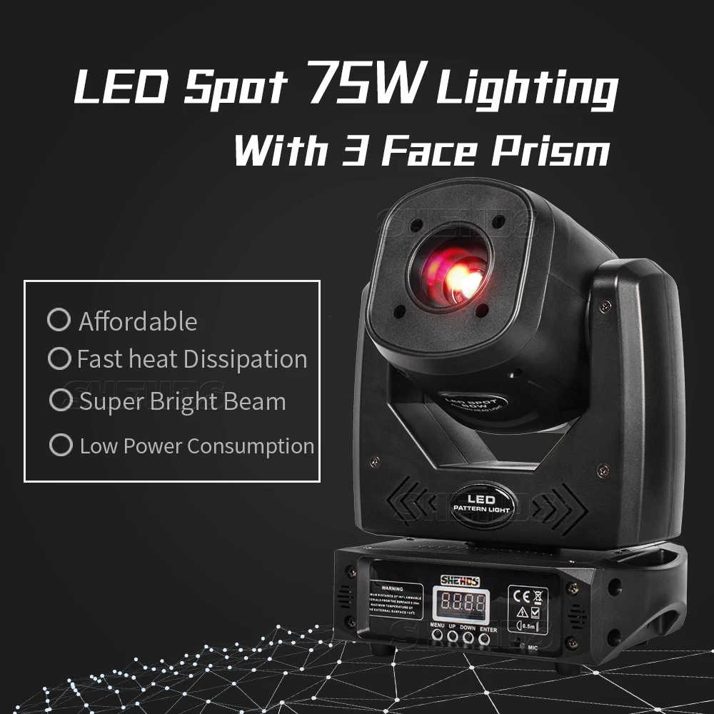 1. Источник питания: AC90--275V,50-60 Гц 2. Потребляемая мощность: 75 Вт 3. Крепежная лампа: светодиод 75 Вт 4. Угол луча: 25-30 градусов 5. DMX-Каналы управления: 10/13 DMX Каналы 6. Панорама: горизонтальная 540 ° 7. Наклон: вертикальный 270 ° 8. P/T отлично: 8-16 бит 9 、 Призма: 3-лицевая сторона вращающийся Prism 10. Фокусировка: электронная линейная фокусировка от Ближнего до дальнего 11. Челнок: скорость вспышки: 0-16 Гц 12. Рассеивание тепла: воздушная/конвекционная теплопередача 13. Диммер: 0-100% механический диммер Длительный срок службы светодиода (более 60000 часов) 14. Колесо Цвета: 7 цветов цвет s + пустой 15. GOBO:7 узоров + пустые, 2 из которых-стеклянные узоры 16 、 ввода и вывода данных: 3-core XLR разъем аудио разъем