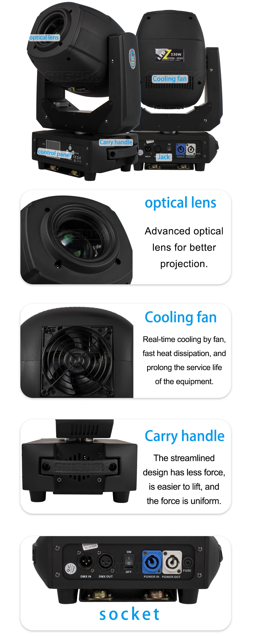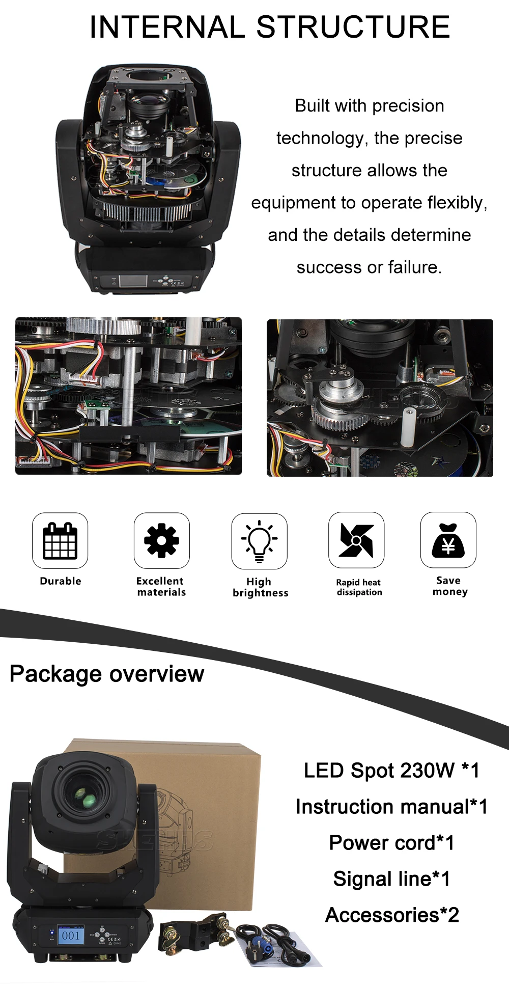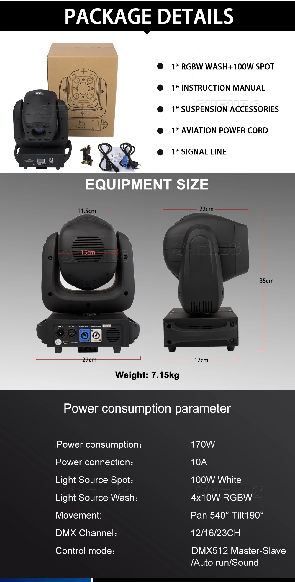 Описание продукта: Вес нетто: 7,15 кг Вес упаковки: 8,25 кг Продукт Размеры: 17x27x35cm Потребляемая мощность: 170 Вт Мощность подключение: 10A Светильник источника пятна: 100W белый Светильник для мытья: 4x10 Вт RGBW Механизм: Pan 540 ° Tilt190 ° DMX канал: 12/16/23CH Режим управления: DMX512 Master-Slave/Auto run/Sound Длительный срок службы светодиодов: более 60000 часов Вилка: штепсельная вилка европейского стандарта, штепсельная вилка американского стандарта, штепсельная вилка австралийского стандарта, штепсельная вилка британского стандарта Часто задаваемые вопросы: CE & ROHS & UL & SAA