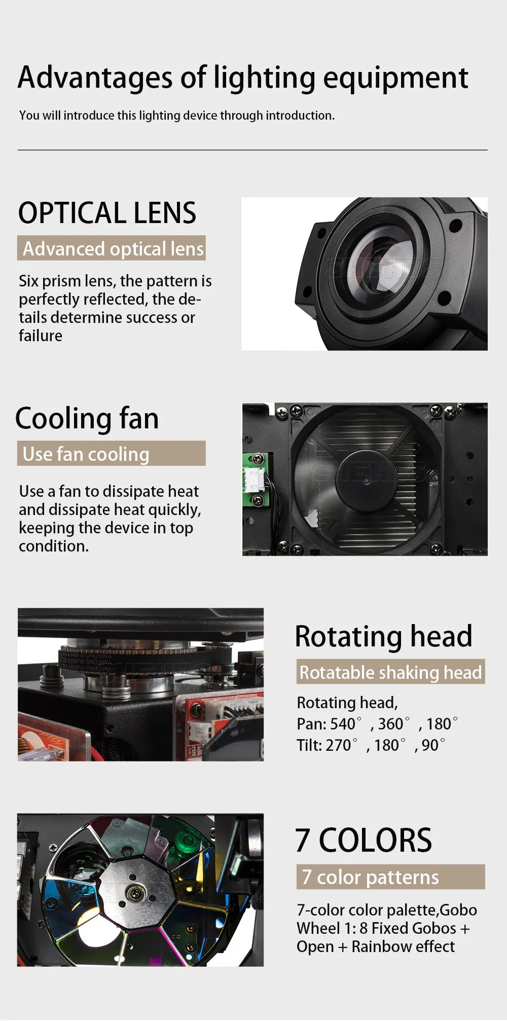 * Цветовое колесо: 8 цветов цвет s + половинный эффект цвета + скорость вращения цвета. Бесконечное вращение Колесо Gobo: 8 gobos + shake + скорость вращения Gobo. Бесконечное вращение