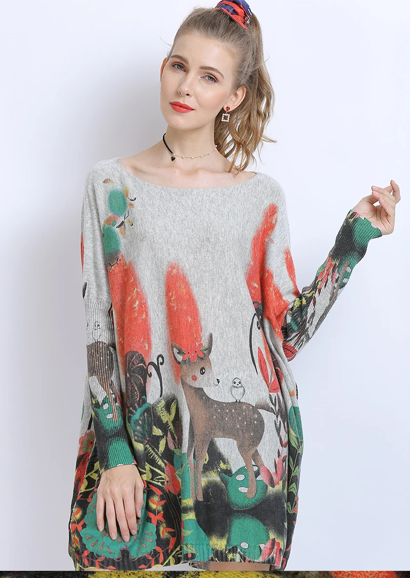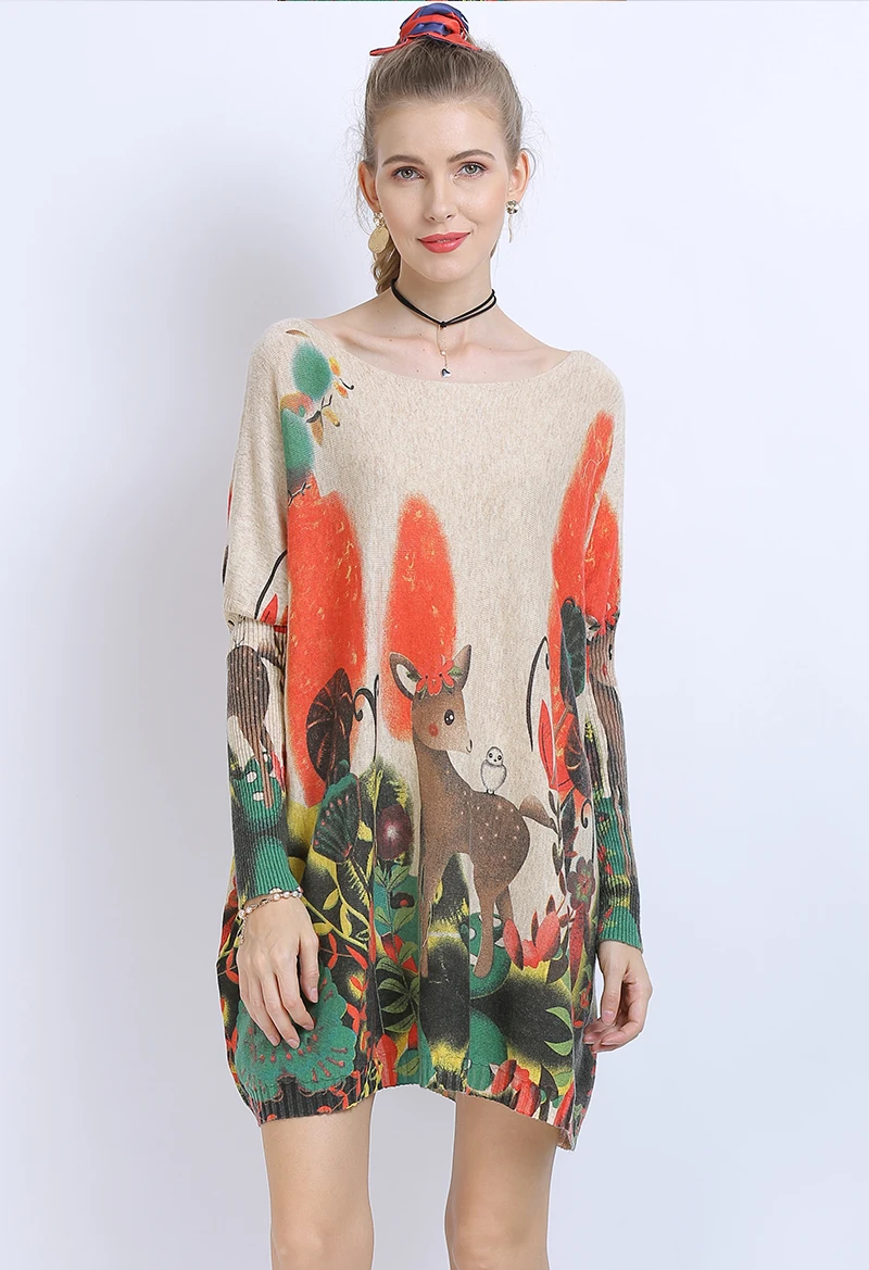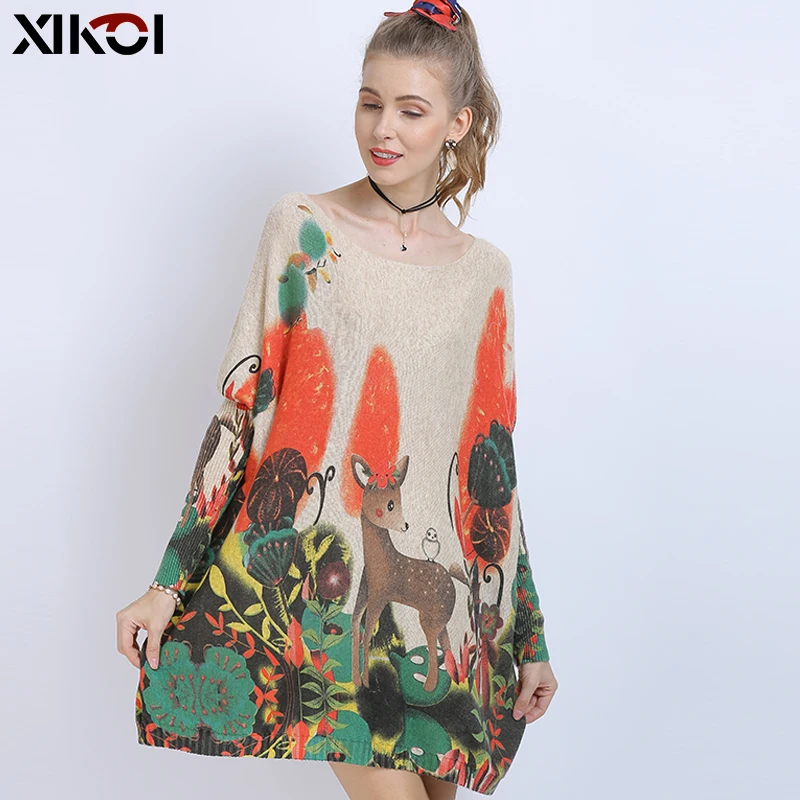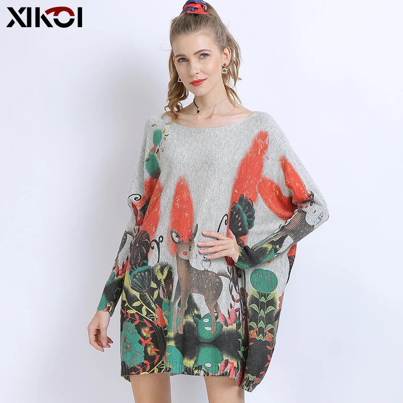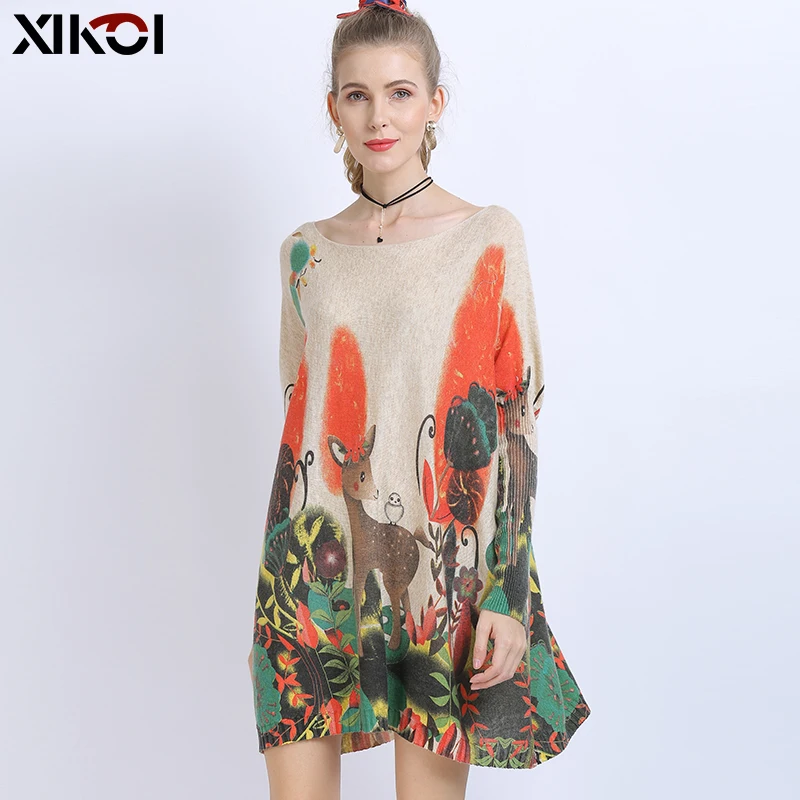 Зимние свитера XIKOI большого размера для женщин, теплые длинные платья-пуловеры, модный джемпер с милым принтом оленя, вязаные свитера для женщин