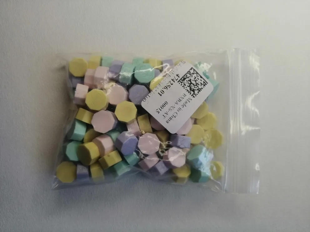 Штамп как на фото, оттиск получается чёткий. Заказывала вместе с "сургучем", там тоже все хорошо и с цветом и с количеством. Один правда пакетик разошёлся по запаяному шву, собирала цветные таблеточки по всей посылке))) Продавцу спасибо.