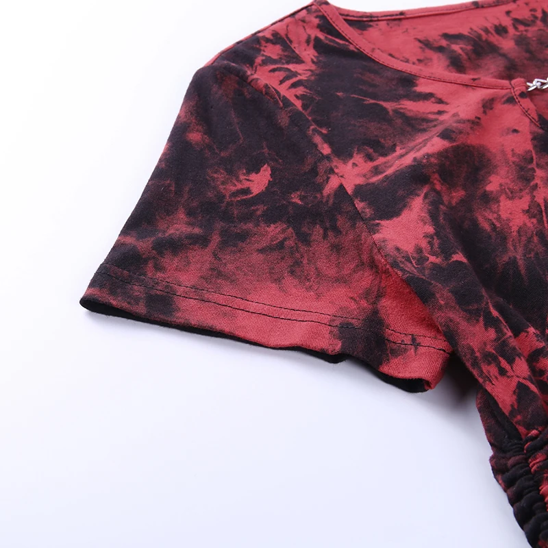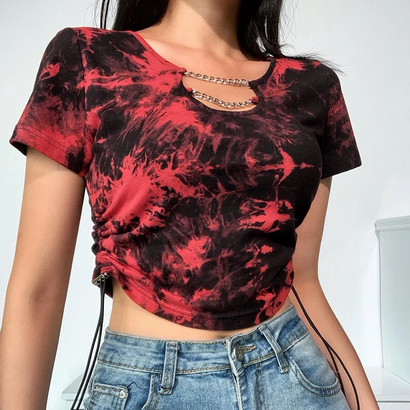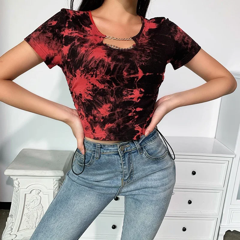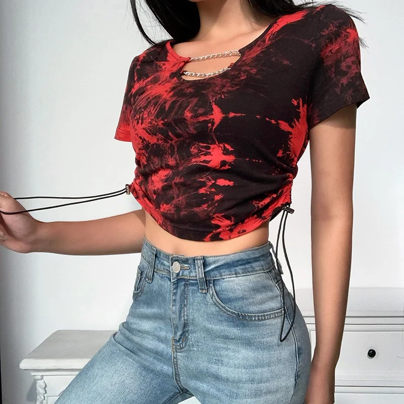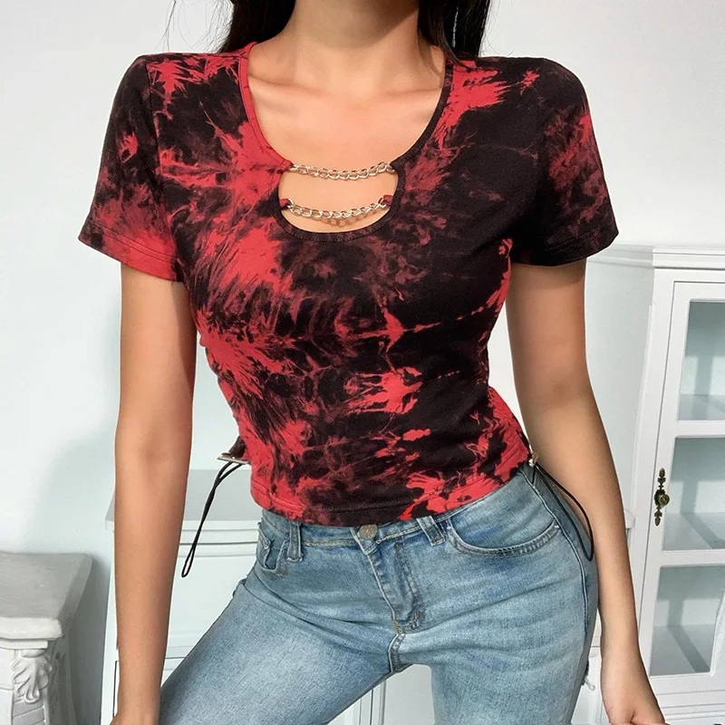 Женская футболка InstaHot с принтом тай-дай, готический уличный топ с короткими рукавами в стиле панк, летняя укороченная футболка с цепочкой и кулиской по бокам, 2020