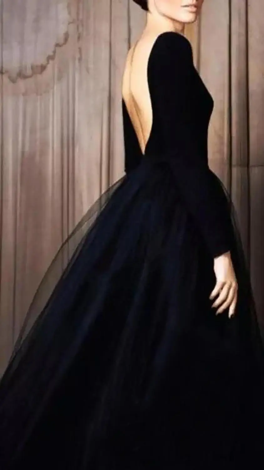 Черные вечерние платья с юбкой-годе, круглым вырезом и аппликацией