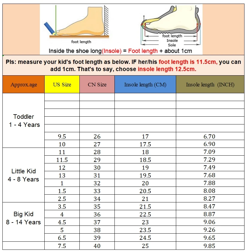 5 . Что касается размера, Измерьте длину стопы ребенка в см или дюймах + 1 см или 0,03937 дюймаChВыберите соответствующий американский размер, спасибо
