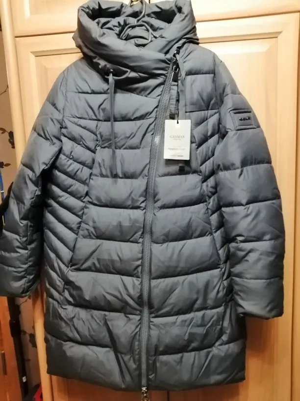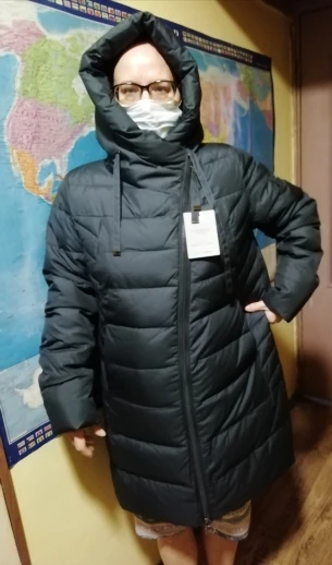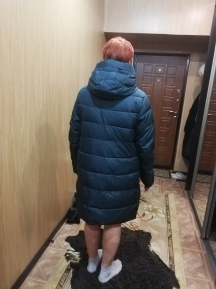 Куртка просто отличная! Маме подошла идеально. Длина чуть ниже колена на рост 155 см. Куртка не в обтяг, есть место чтобы пододеть джемпер. Она носит 56 размер, я заказала 5хl. Цвет смотрится очень красиво, приятный, не броский. Качество отличное, глубокий капюшон, не слетает. Продавец положил подарок, купон на 5 долларов. Доставка очень быстрая.