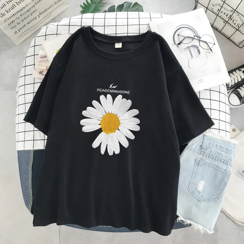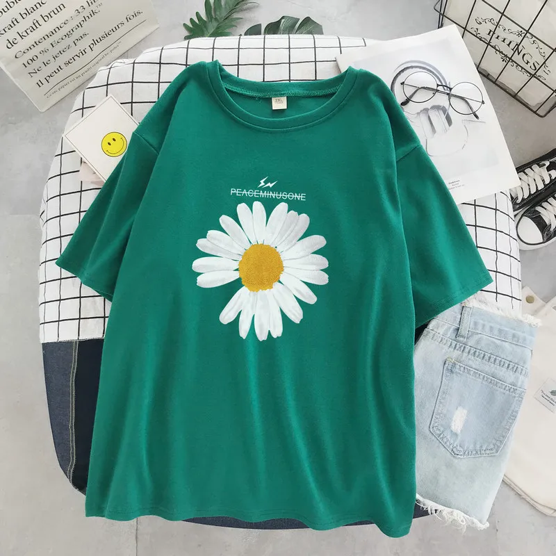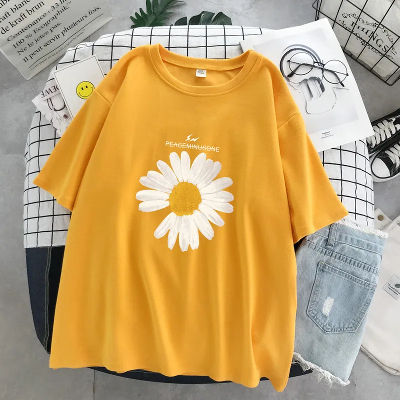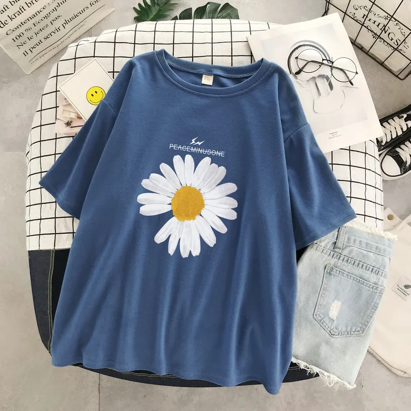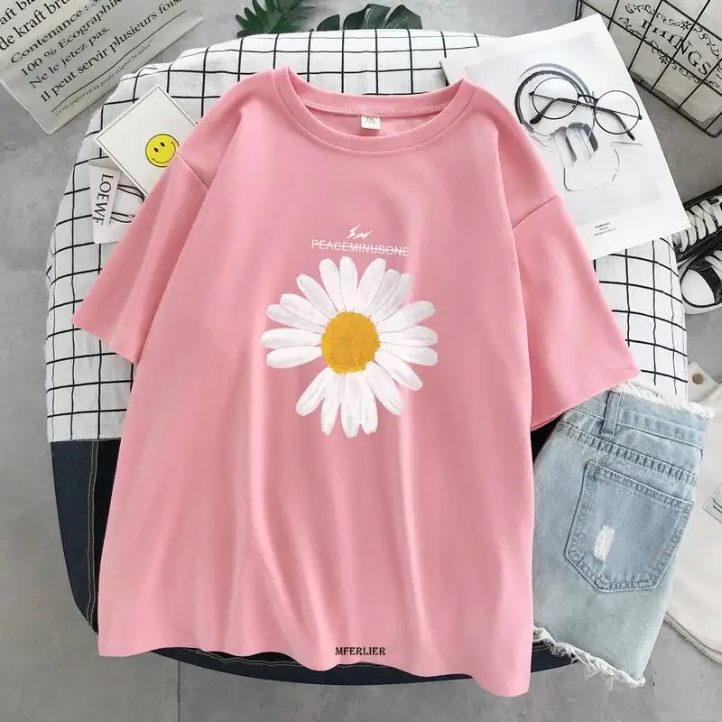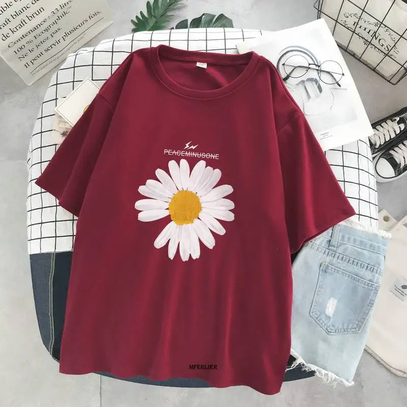 Женская летняя футболка с цветочным принтом, круглым вырезом и коротким рукавом