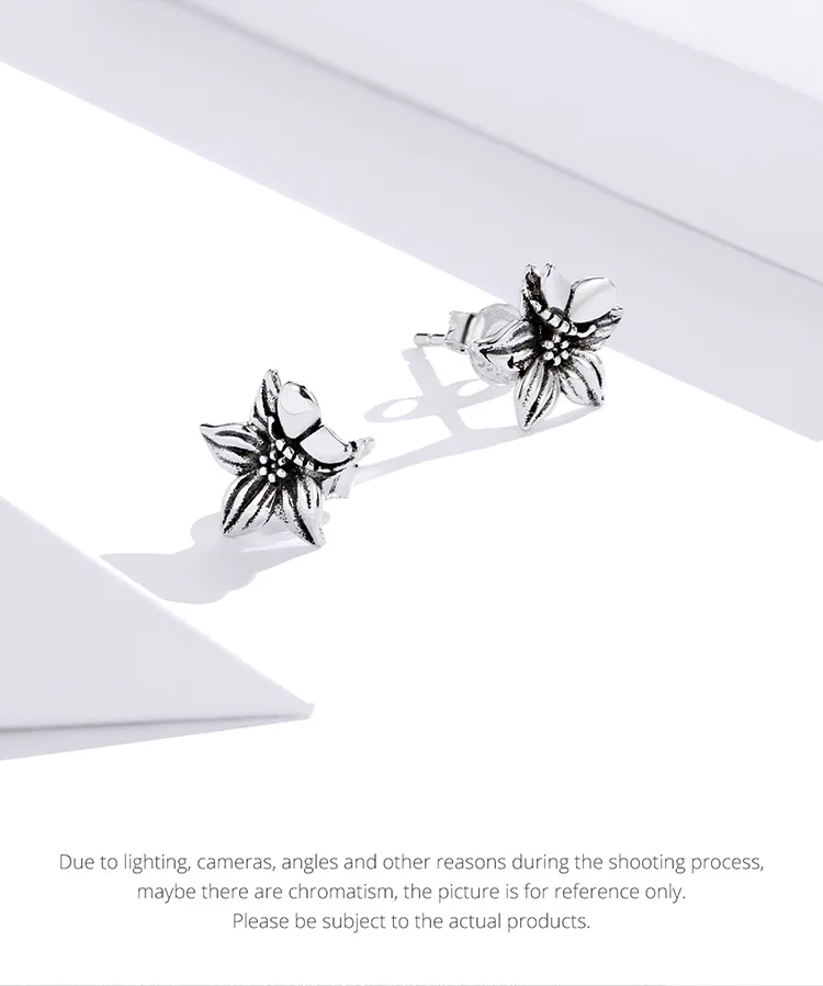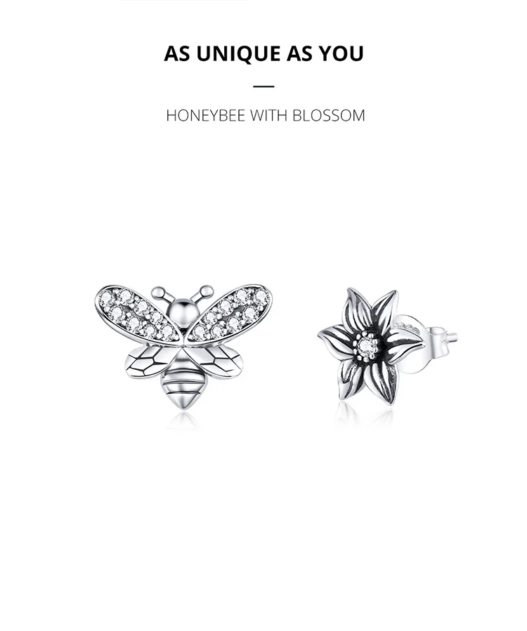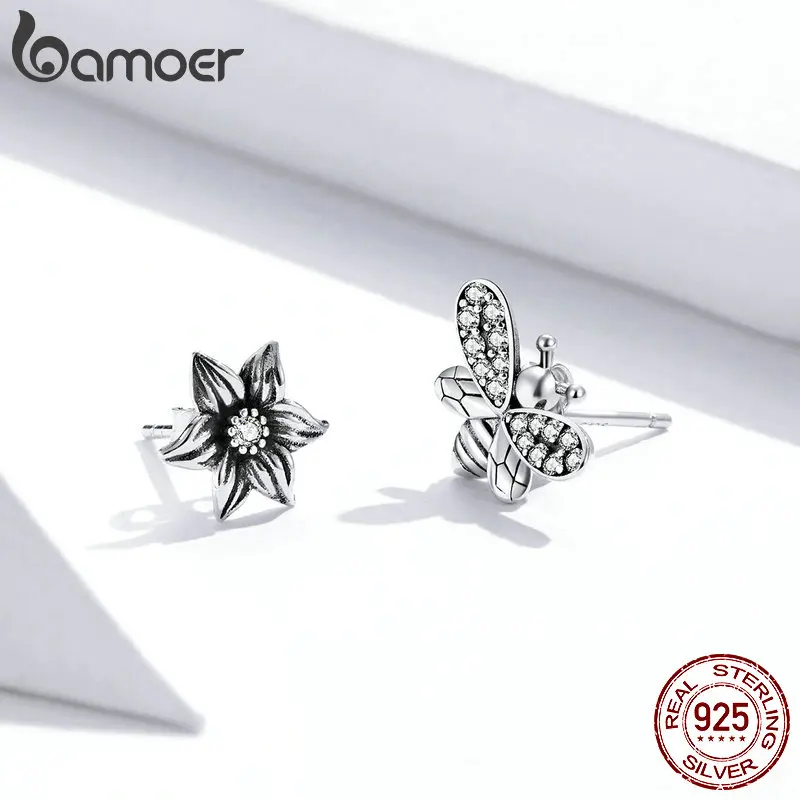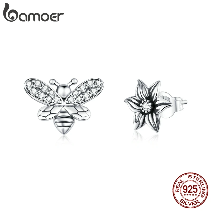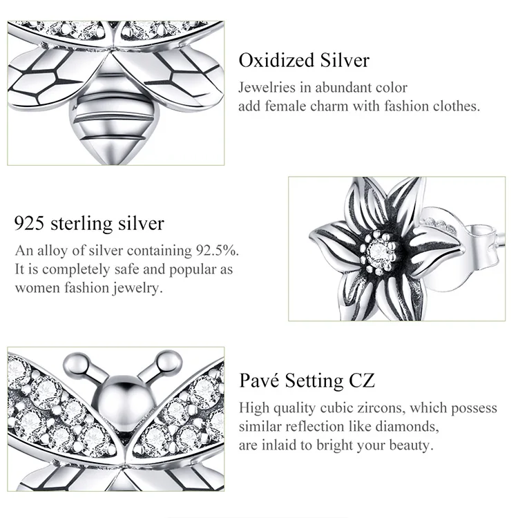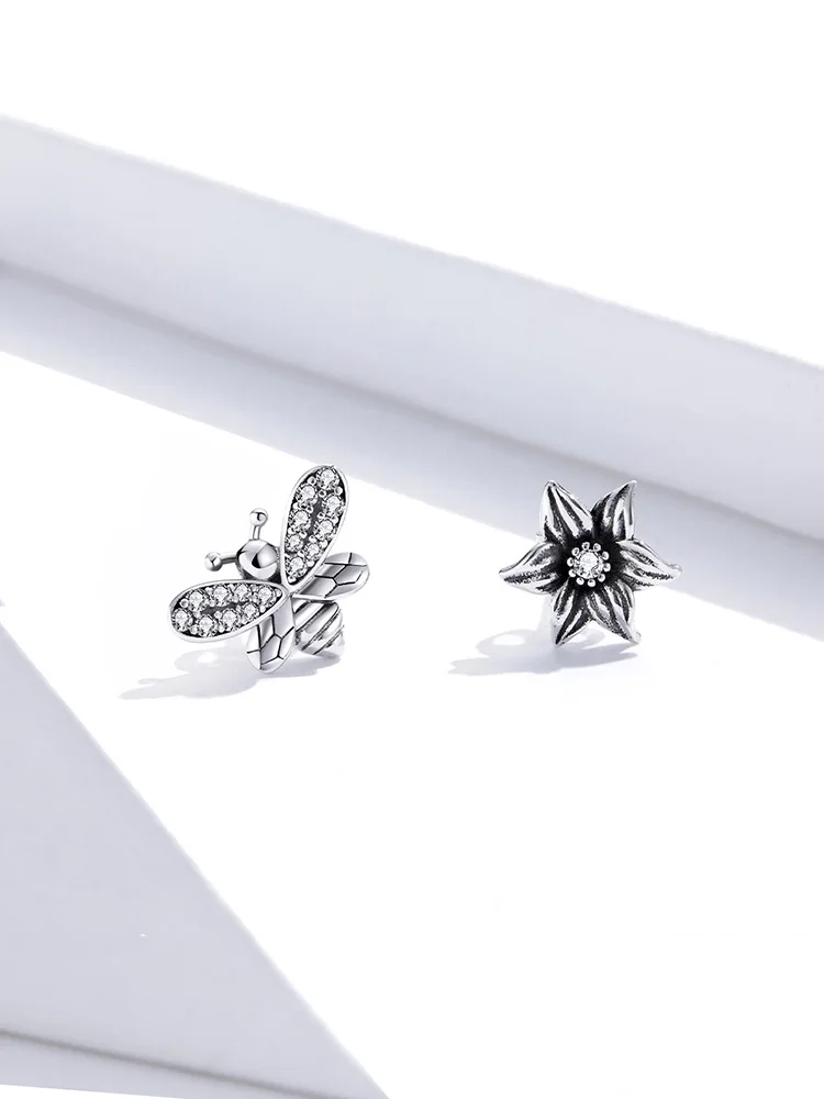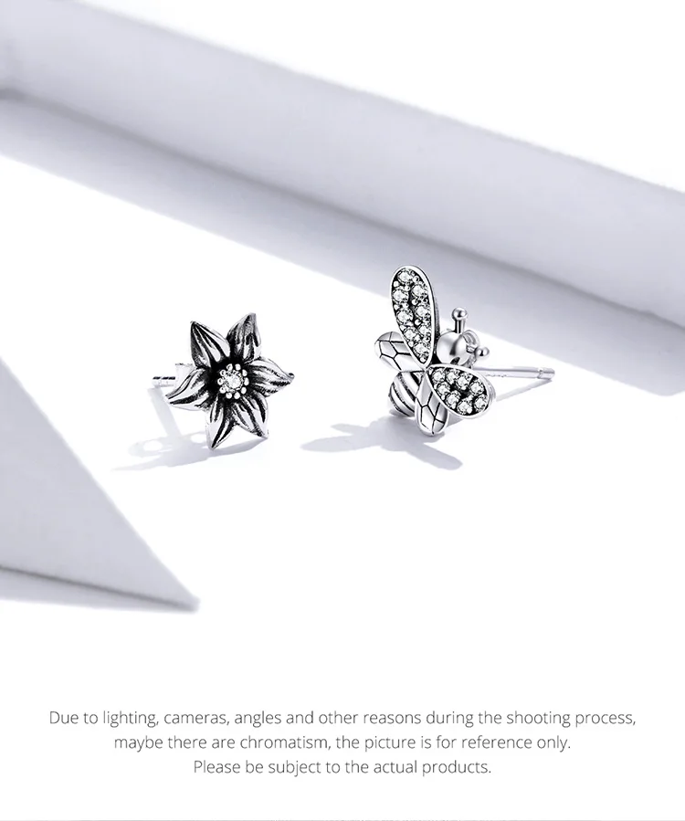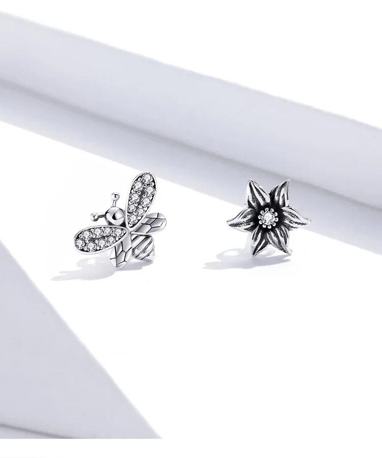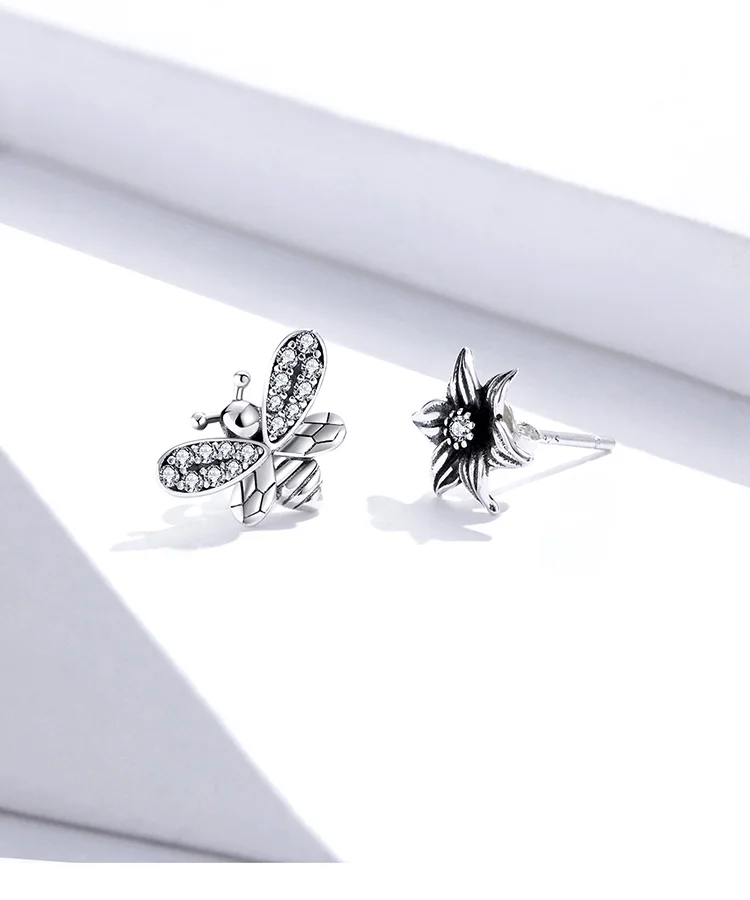 Женские серьги-гвоздики из серебра 925 пробы с пчелами и цветами