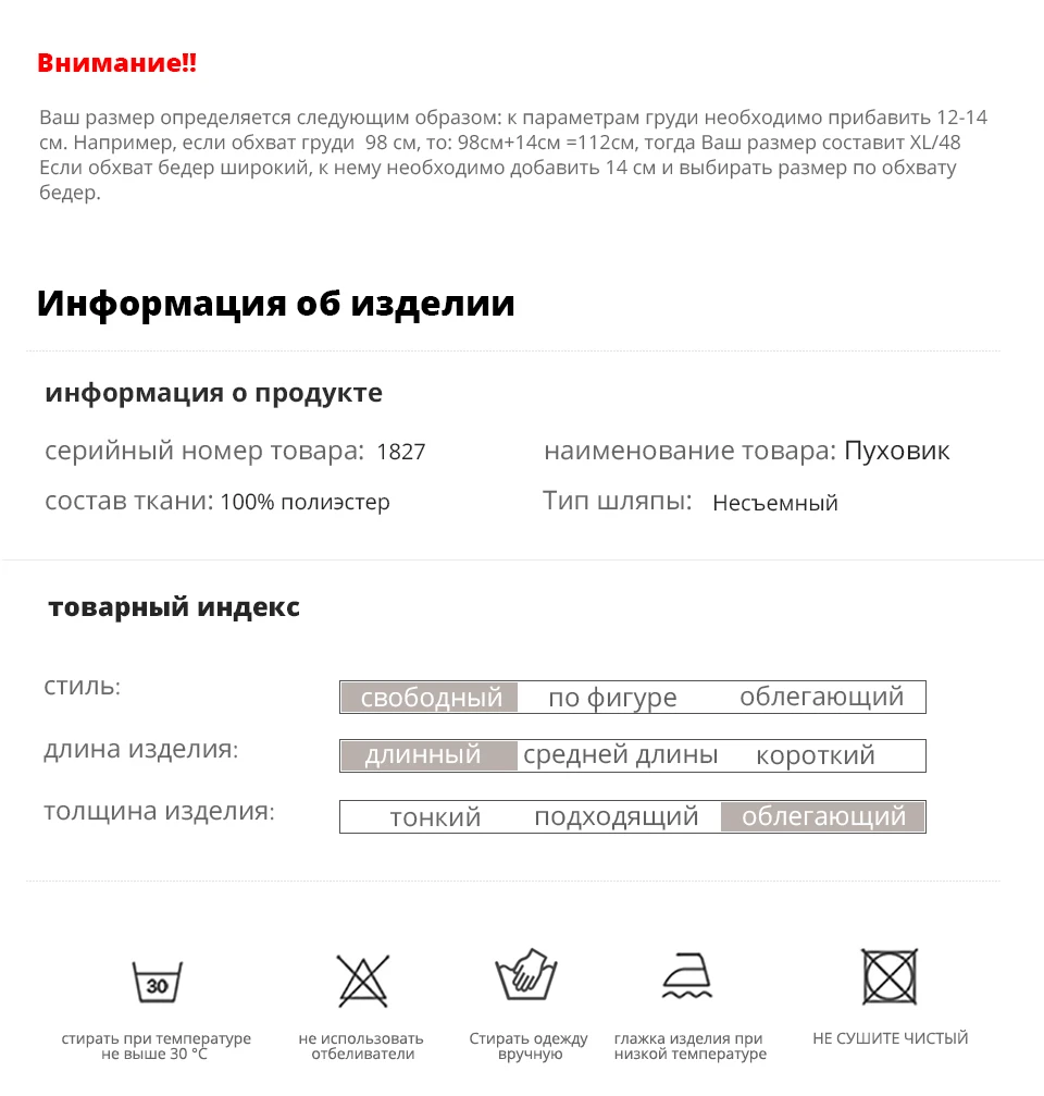 Пуховик отличный и полностью соответствует описанию в комментариях от других покупателей, благодаря им я и сориентировалась в данном выборе. Мои параметры: 93/78/98. Взяла размер L. Качество материала понравилось, водоотталкивающий. Очень теплый пуховик (под него не обязательно натягивать на себя плотные свитера) а значит лютая зима не страшна будет. Цвет выбрала зелёный (темный), смотрится богато. Прилагаю фото, на которых показала глубину кармана (внутри плюшевый мягкий материал), капюшон (цельносшитый) и рукава, которые можно слегка отрегулировать. не страшна будет, хотя в Находке она и теплая.