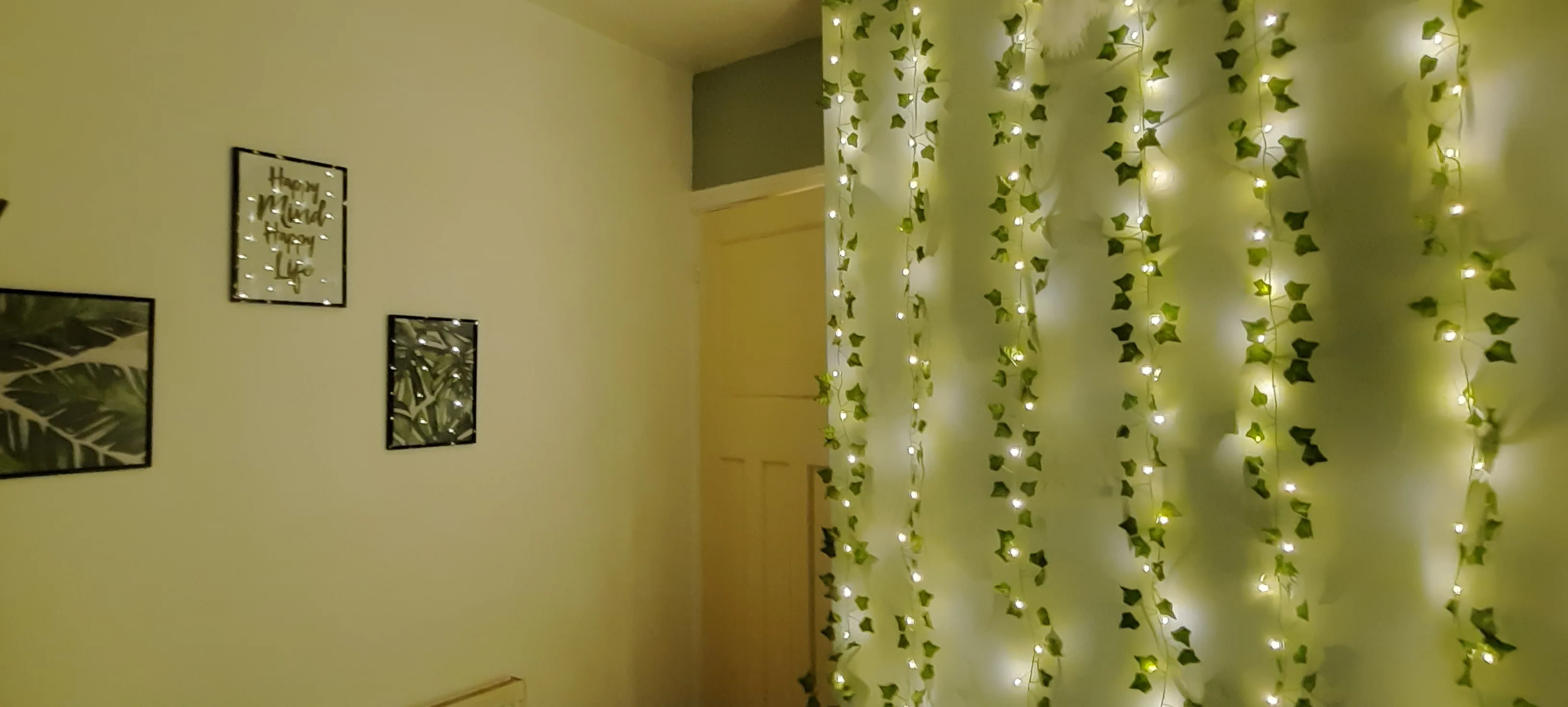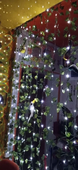 Листики разочаровали. Очень маленькие. Без подсветки выглядит скучно. Зато , когда включается гирлянда,начинается магия! Украсила птичками. Сложила гирлянду в три раза. Ширина получилась в метр,высота - два метра. Для ширины 3 м выглядит лысо. Пульт без батарейки, ещё не включала.