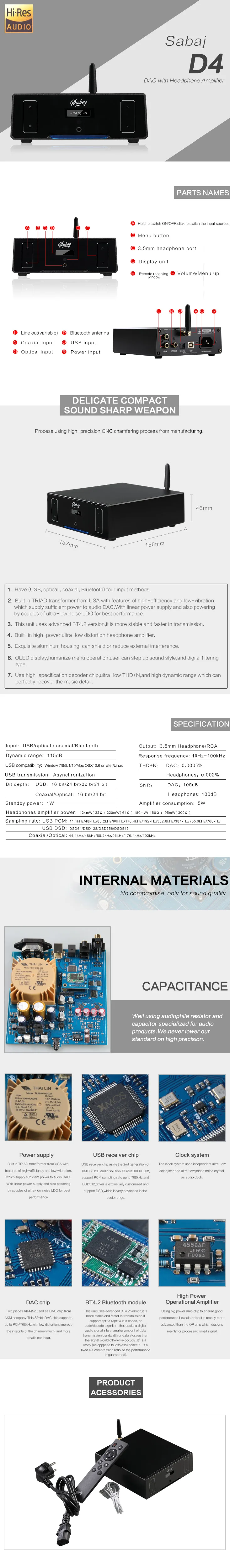 Особенности1. Высококачественный источник питания, сверхнизкий уровень шума и низкая утечка магнитаТороидальный трансформатор.2. 2-е поколение XMOS USB audio solution XCORE200,PCMПоддержка частоты дискретизации до 32 бит/768 кГц и DSD до DSD512, сИндивидуальная поддержка драйвера DSD512.3, сверхнизкий дрожание системы часов, 2 кварцевых осциллятора работает сАсинхронный USB для передачи аудио.4, двойной высококачественный аудио AKM D/AconvertersA4452, сверхнизкий THD + N,И высокий динамический диапазон, который может идеально восстановить детали музыки.5, встроенная высокомощная схема усилителя для наушников с низким уровнем искажений,Драйвер наушников до 200 МВт на канал.6. Используйте много компонентов класса звука.7, гуманизация меню, пользователь может настроить стиль звука и цифровую фильтрациюТип.8, 4 .2 версия bluetooth от CSR.