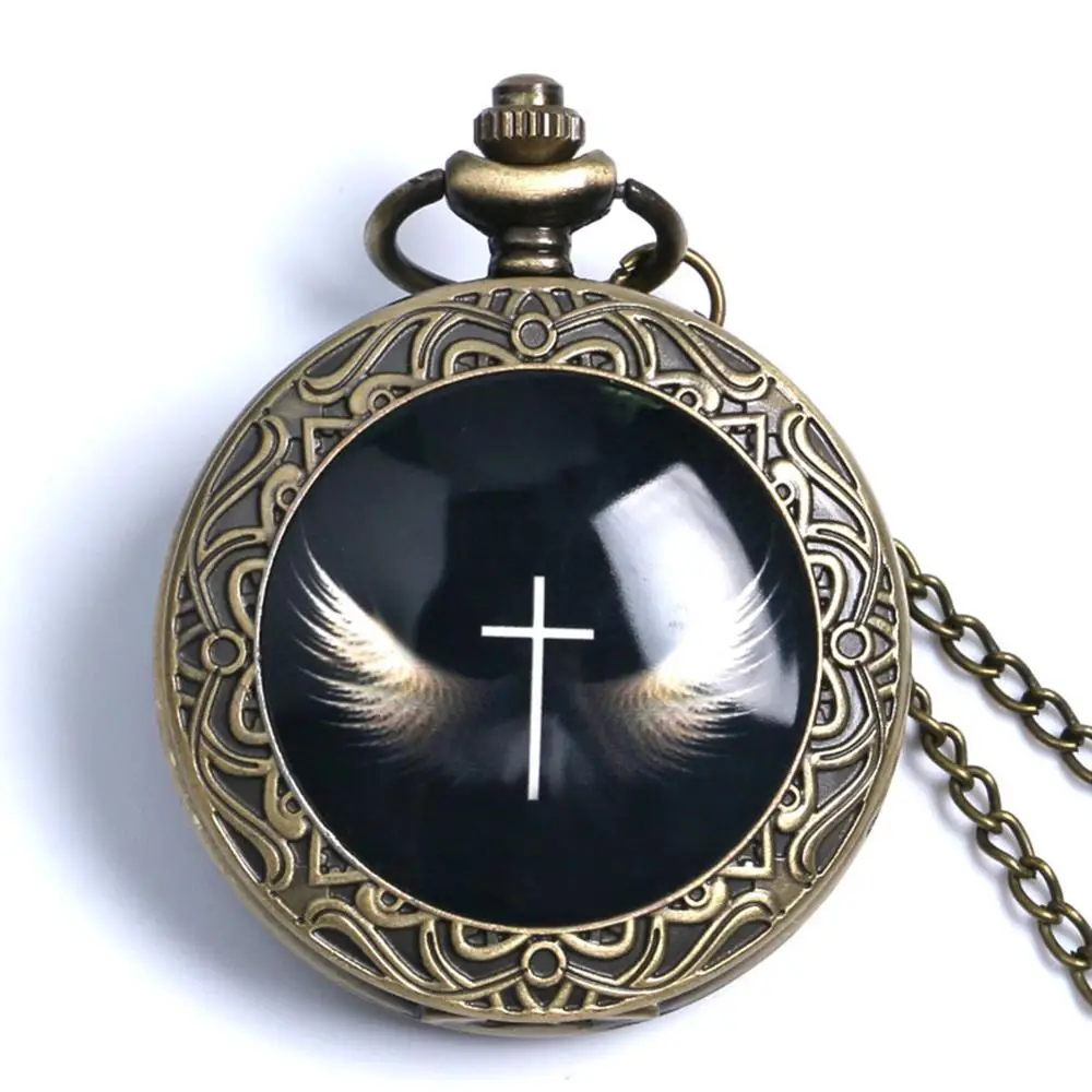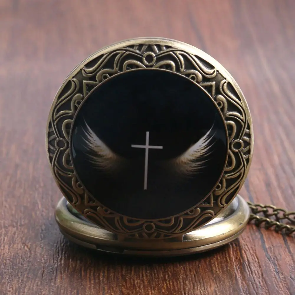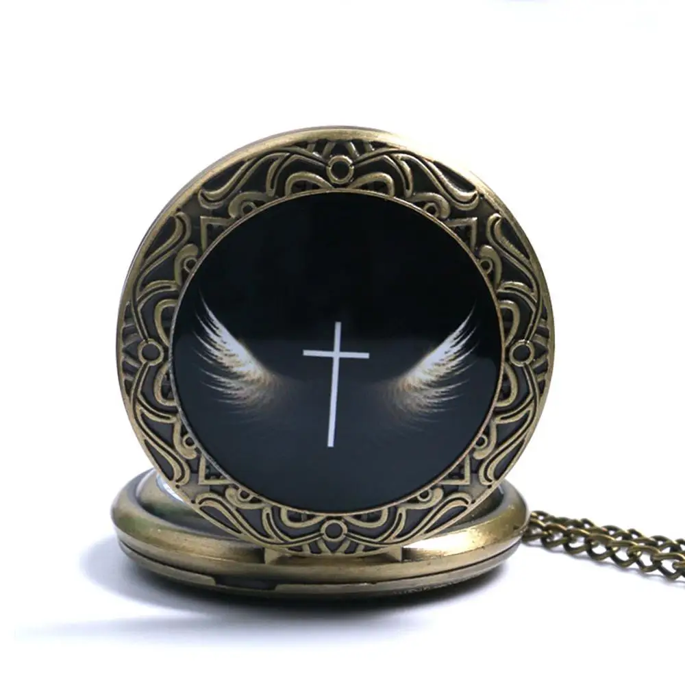 Античный ретро крест с крыльями ангела дизайн бронзовые кварцевые карманные часы Черный Брелок часы с цепочкой кулон ювелирные изделия Часы