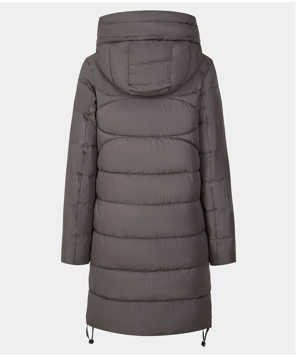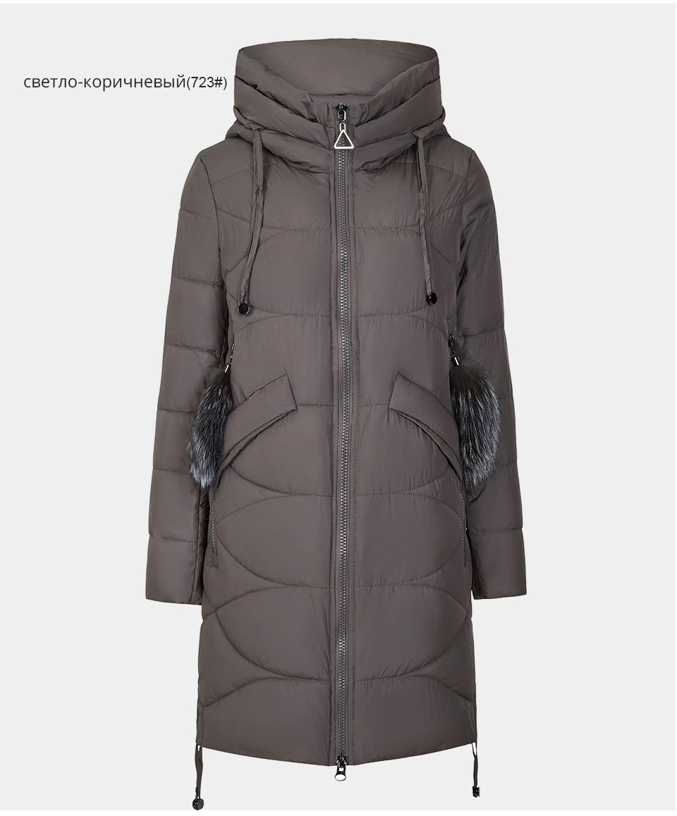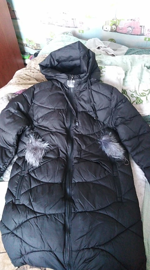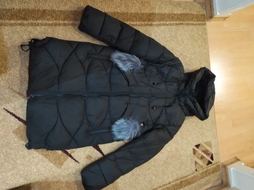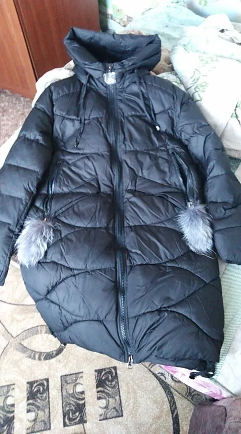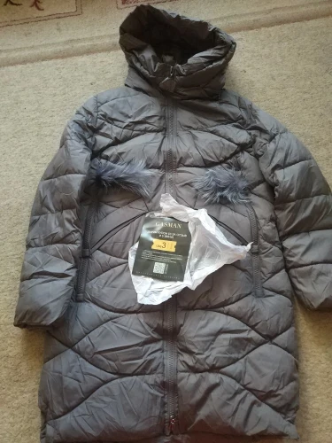 Куртка очень приличная. Качество пошива высокое. Продуманы многие детали. Карманы настоящие сбоку, где меховая кисточка, очень глубокие и теплые. Люблю такое расположение карманов. Не помешали бы и карманы впереди, но это только имитация. Очень понравился капюшон, глубокий, удобный, красиво смотрится в любом положении, можно его подтянуть так, что нигде не будет поддувать. На рукавах трикотажные резинки, рукава достаточно длинные, на мой рост 160, куртка чуть выше колена. Силуэт прямой. На грушу чуть туго внизу и свободно в груди и талии. Не очень понравился цвет. Больше тёмно-серый и чуть хаки. И чуть поскрипывает утеплитель.
