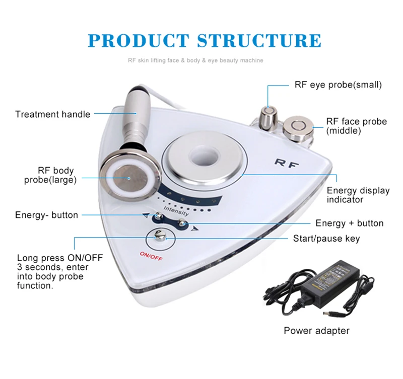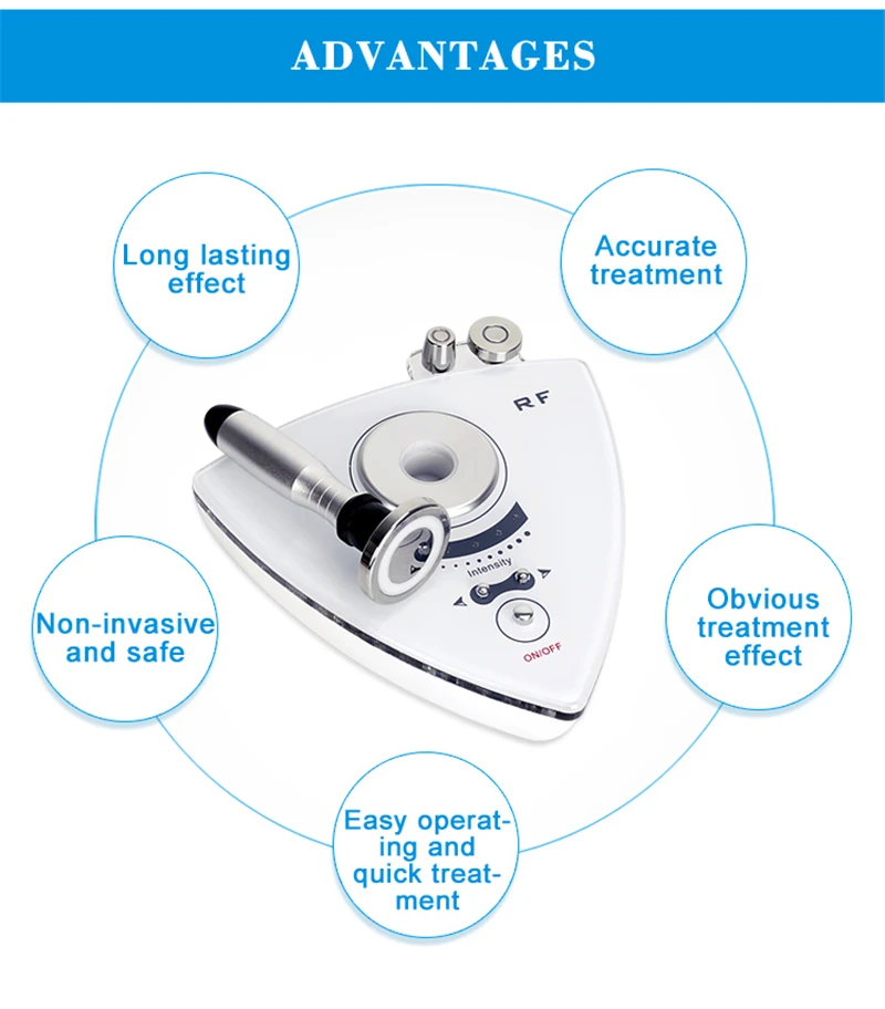 Эффект от кратковременного леченияЭффект от кратковременного лечения и изменения контура лица; Увеличение кровообращения и метаболизма; Улучшение поглощения крема и лосьона и; Уменьшение акне; эффект от длительного лечения, затягивания кожи и уменьшения мелких морщин; Стимулирует коллагеновые клетки и повышает гибкость кожи и затягивает большие поры.Улучшает поглощение кремаУлучшает поглощение крема и лосьона и уменьшает акне. Улучшает кровообращение и обмен веществ.Эффект от долгосрочного леченияЭффект от длительного лечения, затягивания кожи и уменьшения мелких морщин. Стимулирует коллагеновые клетки и повышает гибкость кожи.Простота в использованииМогут быть обработаны для лица, глаз и других частей тела в качестве альтернативы для частого использования без необходимости замены. Он лучше работает, когда используется с некоторым гелем или сывороткой, чтобы он плавно катался по лицу и позволял радиоволнам проникать в кожу. И это низкочастотный микро-ток специально для лечения вокруг глаз.