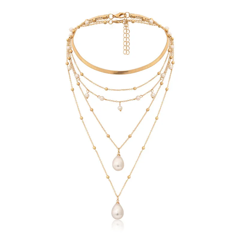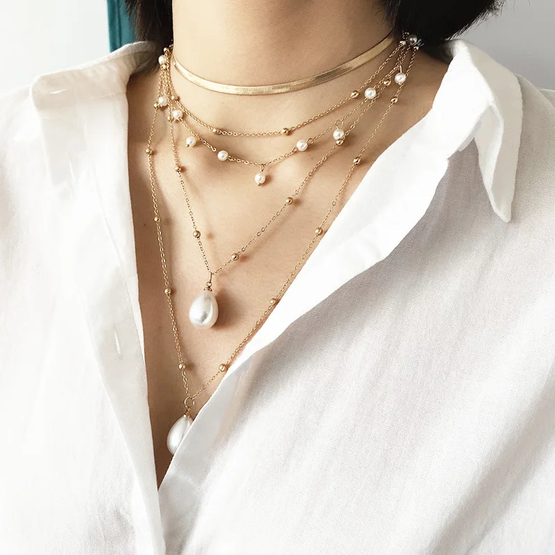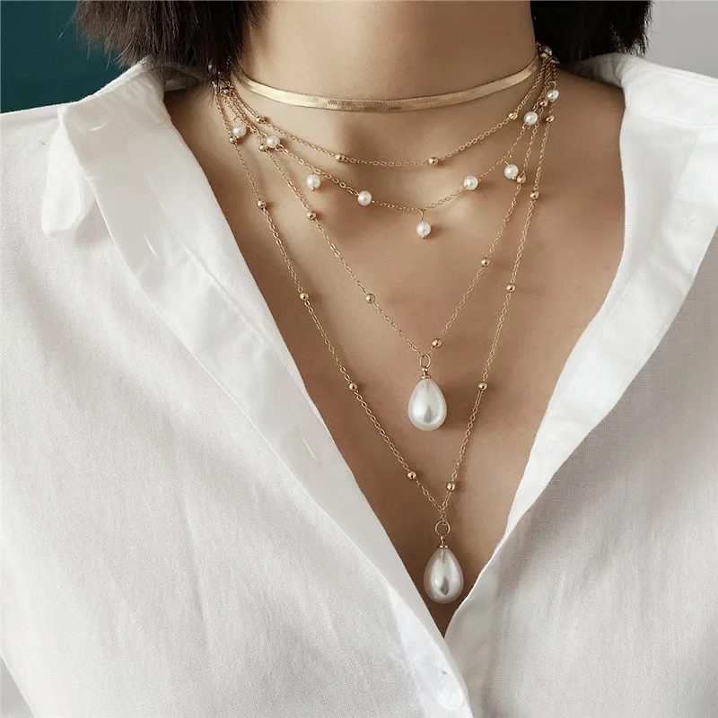 Многослойное ожерелье-чокер в стиле панк с жемчужинами в форме капл...