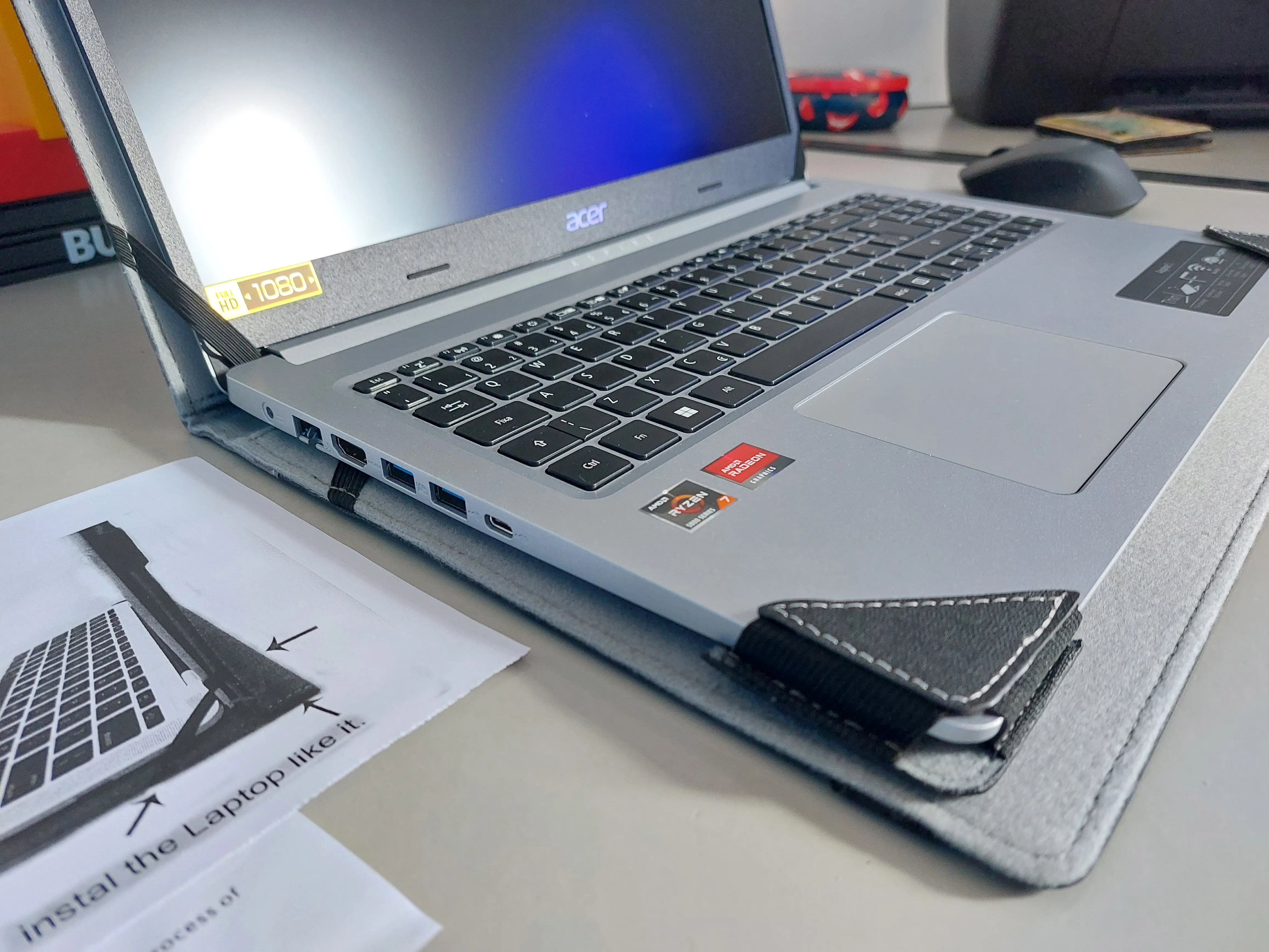 Покрытие отличное! Высокое качество. Он также является адаптивным. Держатели палочки на крышку на липучке стиль крюк (см. фотографии), так что вы можете позиционировать и регулировать его по размеру вашего ноутбука. Он прибыл всего за 7 дней из Китая в Бразилию, на другой стороне земного шара. Он также поставляется с ручкой и некоторыми дополнительными держателями крюка на липучке. Ноутбук Acer Aspire 5 A515-45-R760 с AMD Ryzen 7 Процессор. Размер ноутбука 163x250 мм Размер крышки @-@ 380x250 мм Совет: купите чехол немного больше, чем ваш ноутбук, так что вы можете настроить его для посадки.