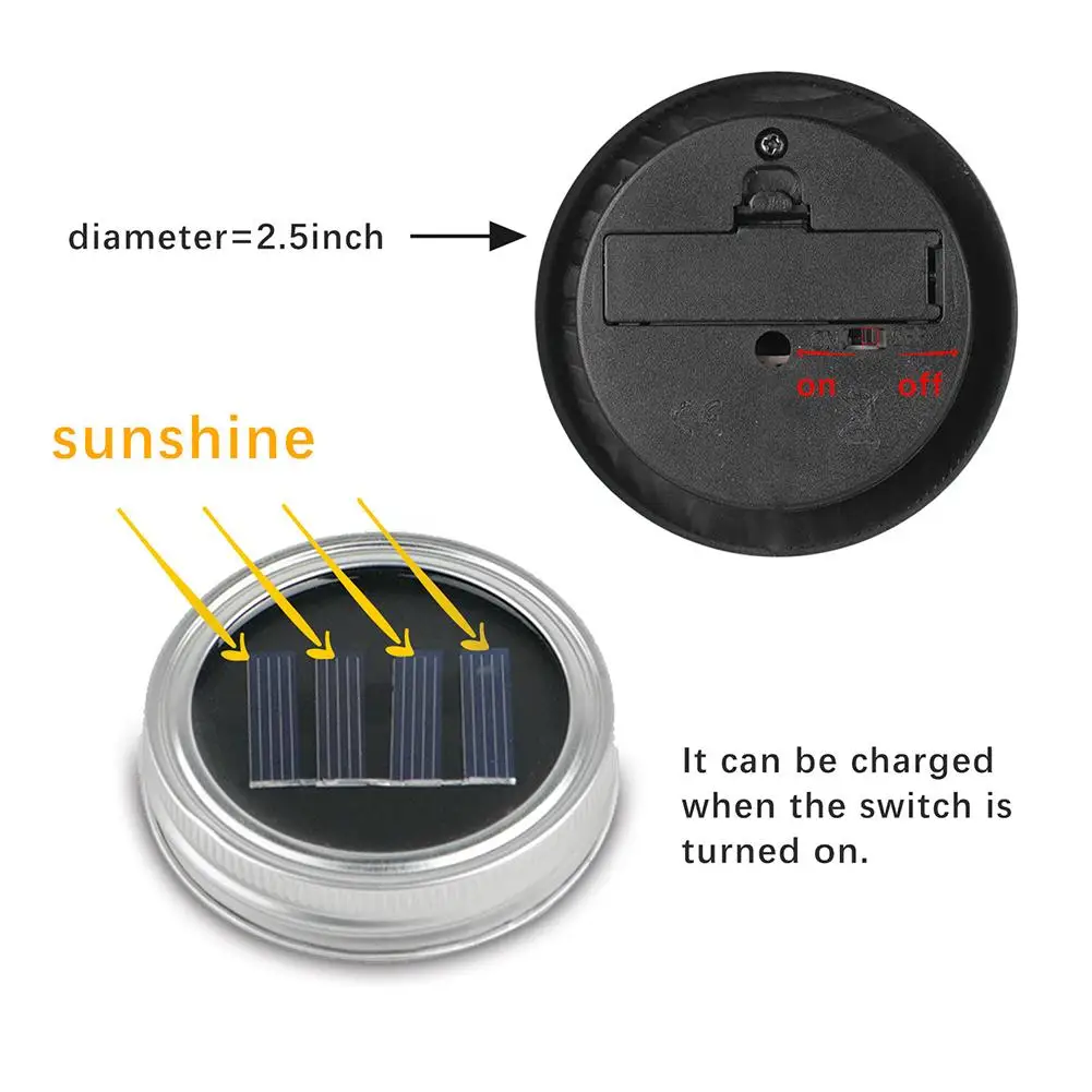 Название: светильник на солнечной батарее Mason Jar Светильник Размер корпуса: около 7*7*14 см/2,76*2,76 * 5.51in Светильник источник: 20 штук 0603 бусинковые лампы Номинальная мощность: 1 Вт Цвет: теплый белый/четыре цвета s Солнечная панель: 2 в Аккумулятор: 2A 600 мАч Время солнечного света: 6 ч Время освещения: 8-10 ч Уровень защиты: IP65 Срок службы: 10000H Инструкция: Включите переключатель на солнечной крышке, и этот выключатель должен быть включен только один раз, солнечный светильник будет автоматически заряжаться в течение дня. Упаковочный лист: