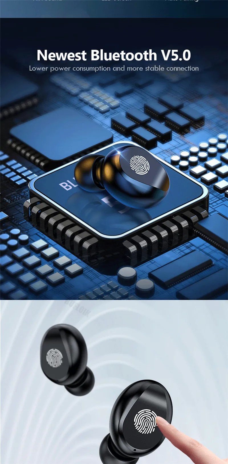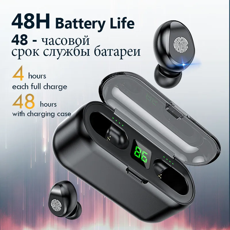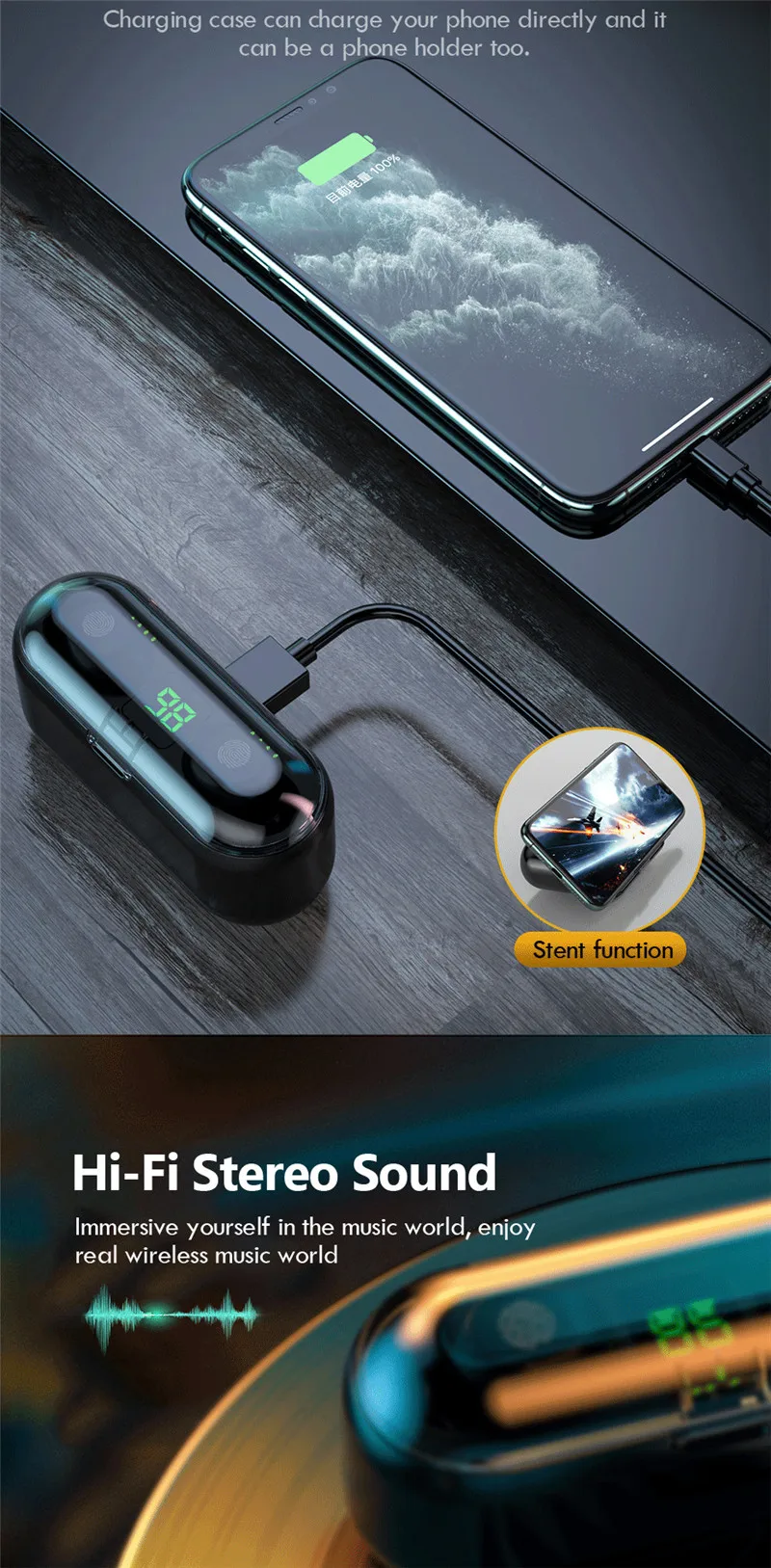 1. Наушники с дыхательной вспышсветильник 2. Цифровой и светодиодный дисплей мощности 3. Телефонный звонок HiFi и HD 4. Большая зарядная коробка на 2000 мАч 5. Наушники с сенсорным управлением отпечатком пальца