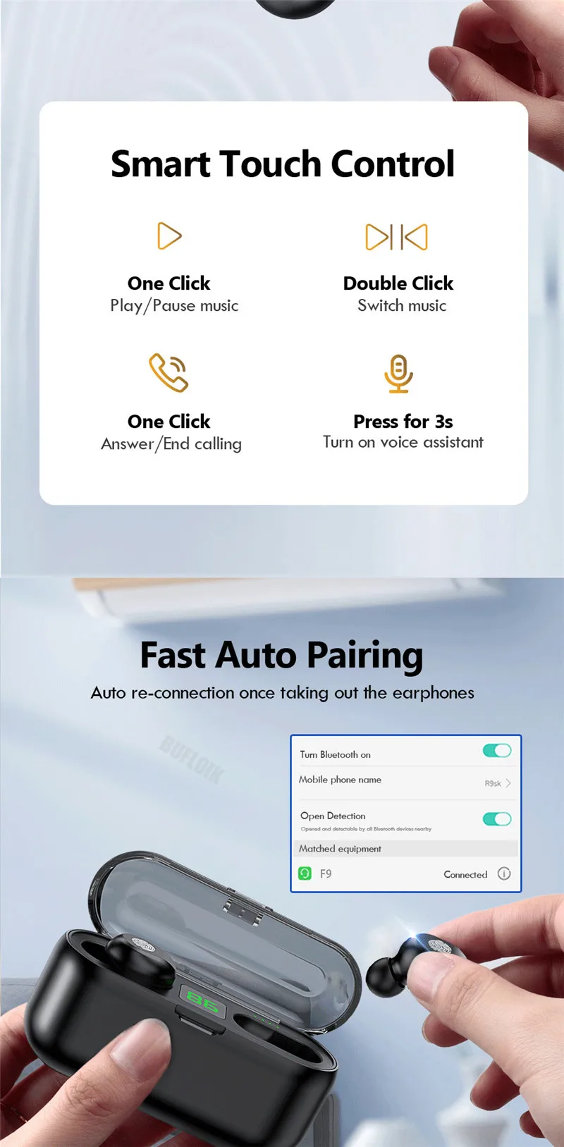 Беспроводные наушники F9, Bluetooth 5,0, TWS HIFI, мини-наушники-вк...