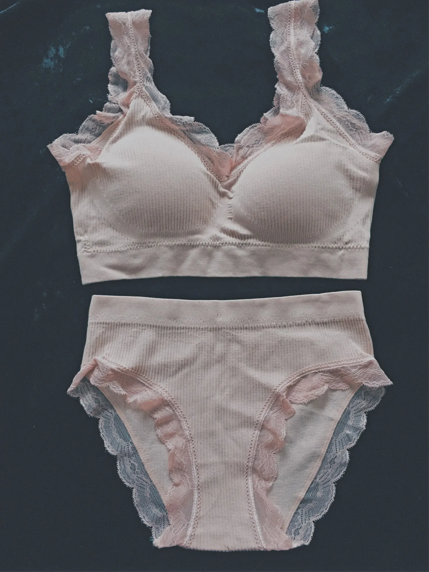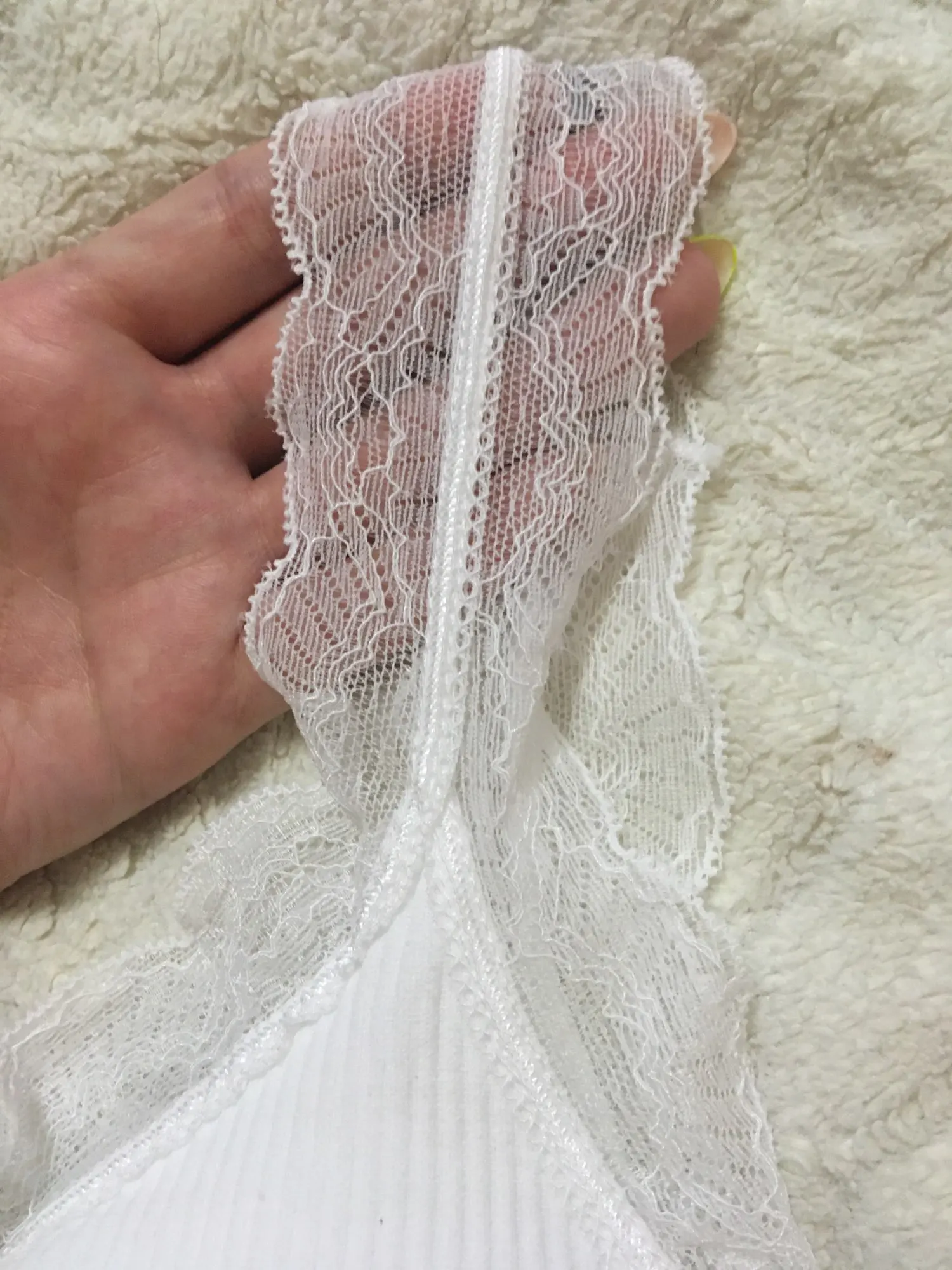 Красивый комплект , ровное кружево . Швы тоже все ровные . У меня общий размер 42 , село все отлично
