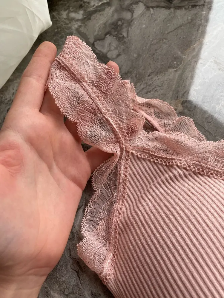 Идеально сидит на девушка худых и с маленькой грудью, но есть небольшой брак, разъезжаетчя ткань между чашками