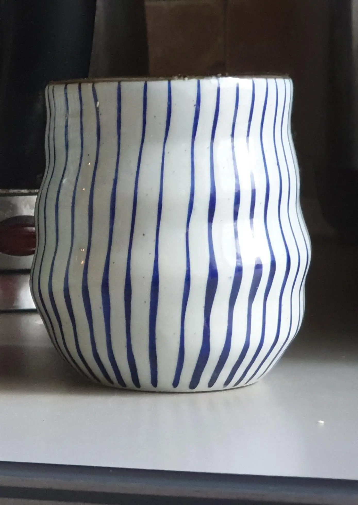 На фотографии отчетливо видно что полоски должны быть более частыми и более яркогого голубого цвета, плюс у кромки будет темный подтек как на фото продавца(см.мои фото). В жизни дизайн гораздо более тривиальный, ничего особенного + завышенная цена. Чувствую себя обманутым.