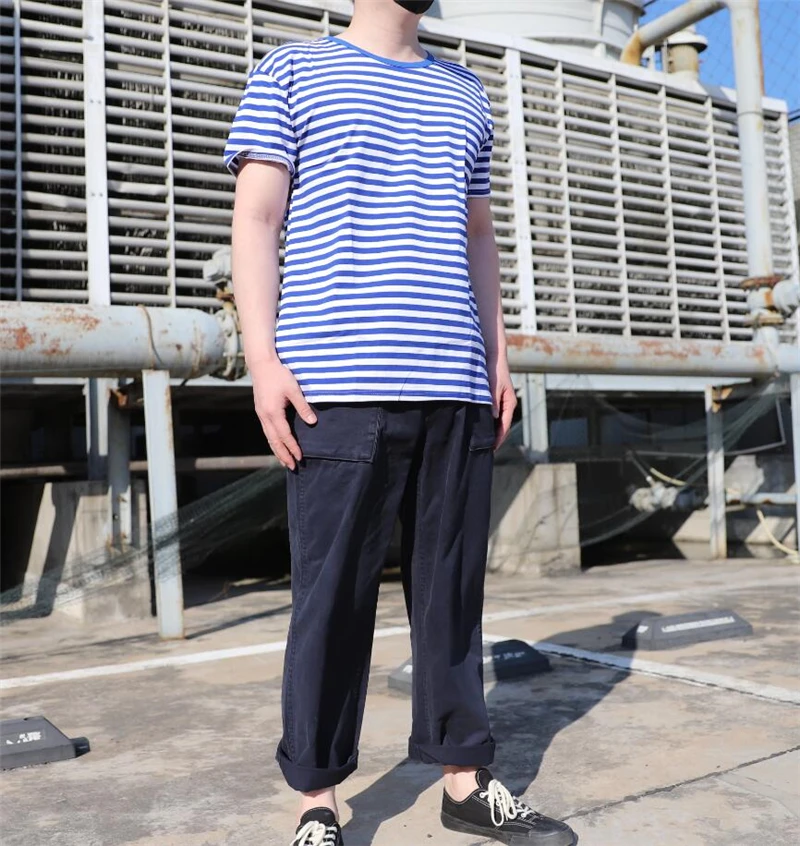 Футболка в полоску моряка происходит от военно-морской эскадрильи советской патриотической войны во время Второй мировой войны. Он представляет собой огромный океан и голубое небо. Причина, по которой темно-синяя рубашка в полоску была впервые оснащена, заключается в том, что футболка имеет практичную функцию. Когда моряк случайно падает в море с палубы, они могут быть быстро обнаружены. Также говорят, что оптический эффект, создаваемый горизонтальными полосами, может создавать иллюзию большего количества солдат, чем реальных.