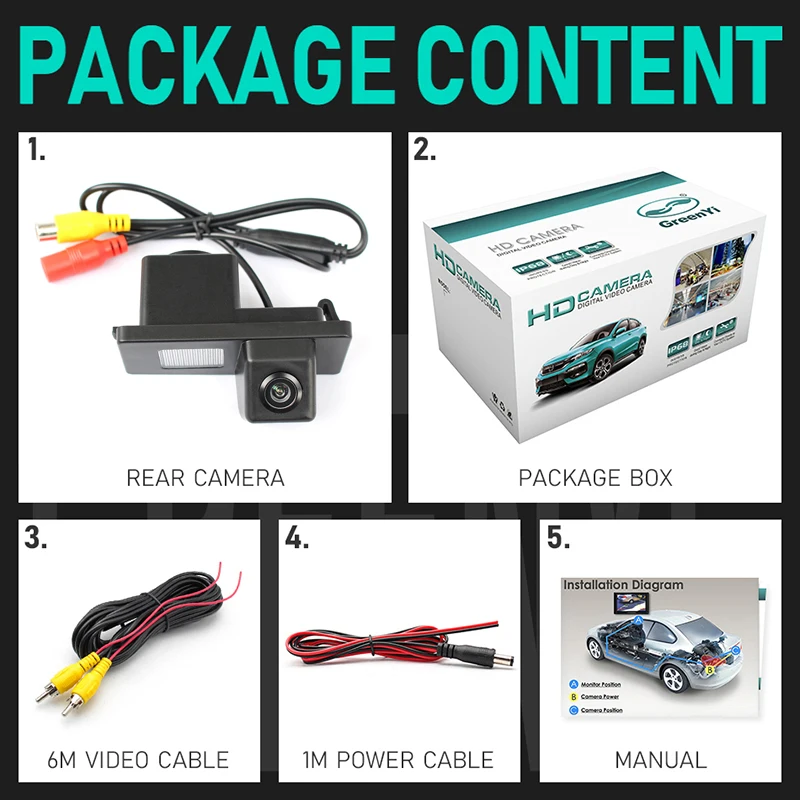 Особенности:* Использование цифрового датчика траектории изображения CCD предназначено для разработки дизайна автомобильного заднего вида с использованием технологии цифровой заливки и программного обеспечения, четкого изображения в дневное время и ниже в ночное время.* От-35 до + 60 температурный диапазон применения, полностью соответствует применению автомобильной среды.* Фабрика после испытания на погружение в воду высокого давления и 12 часов на электрическое испытание на старение, многослойный водонепроницаемый дизайн, действительно высокое давление стирки и погружения* 6 м видео кабель подключения монитора, кабель питания подключения автомобиля задний светильник питания, Реверсивный, реверсивная система мониторинга автоматически начинает работать, вы можете ясно видеть автомобиль после ситуации1. Датчик изображения: CCD 4089T динамическая траектория чипов2. ТВ-система: опция NTSC / PAL3. ТВ-линия: 720 ТВ-линия4. Эффективные пиксели: 960x720 пикселей.5. Низкий светильник ночного видения, 6 м видимое расстояние для ночи.6. Объектив камеры: 4 стеклянных объектива 155 градусов широкий угол.7. Мощность: 12 В постоянного тока8. Длина видеокабеля: 6 м9. Длина кабеля питания: 1 м10. Подходит для Android dvd-плеера и любого TFT автомобильного парковочного монитора.Посылка включает в себя:1. Камера траектории заднего вида2. Self-винт стук3. Видео кабель 6 м4. Кабель питания5. Руководство пользователя