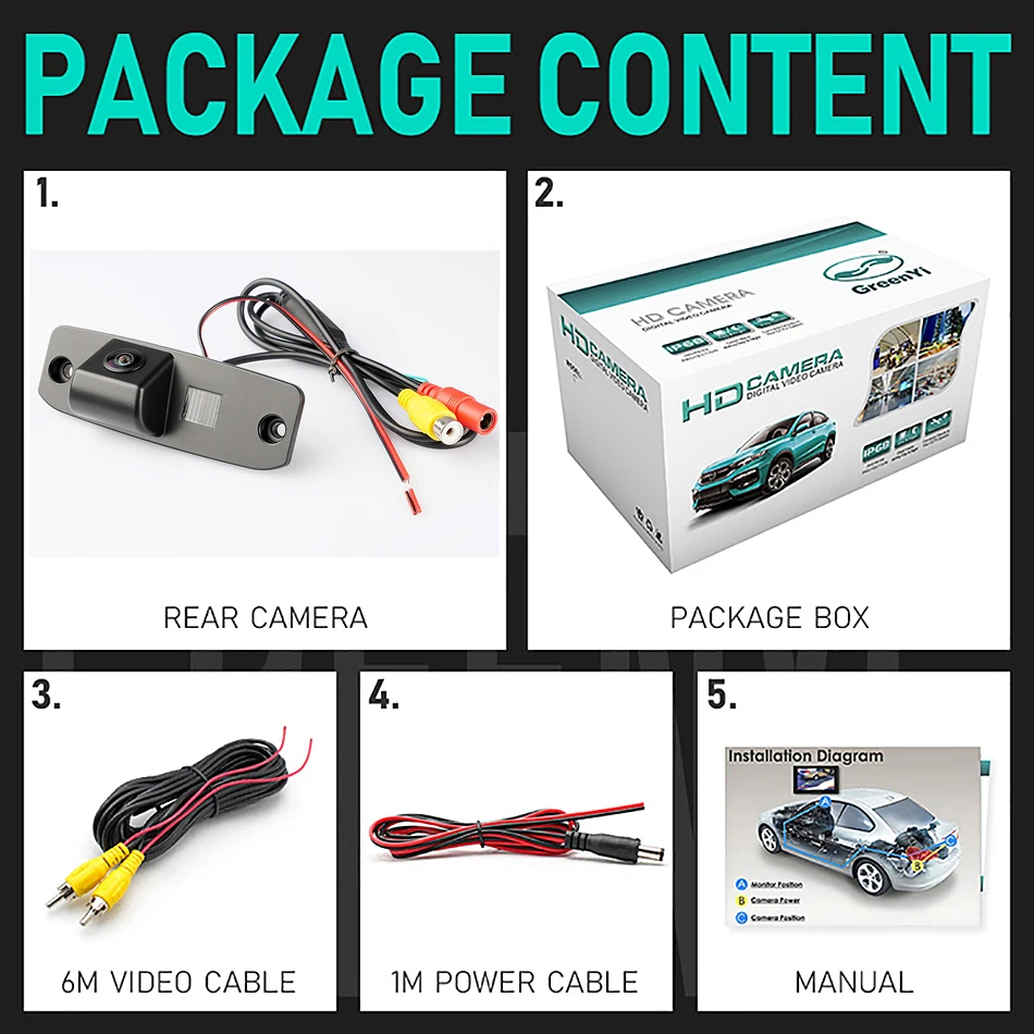 1. Камера заднего вида FS-HD2. Самонарезающий винт и коробка3. Видеокабель 6 м4. Кабель питания5. Руководство