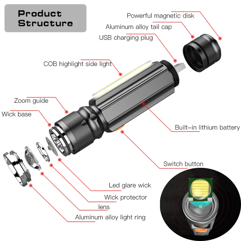 Многофункциональная СВЕТОДИОДНАЯ вспышка с зарядкой по USB, мощный фонарь T6 со встроенным аккумулятором, рабочий Магнитный светсветильник льник с COB матрицей, 6000 люмен
