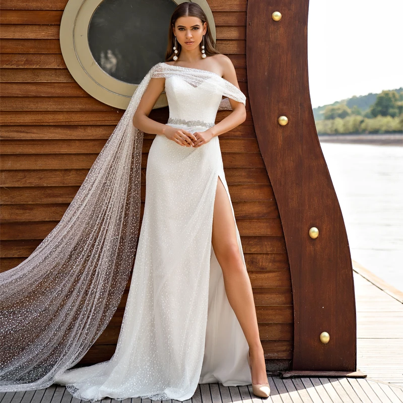 Женское свадебное платье It's yiiya, белое ТРАПЕЦИЕВИДНОЕ ПЛАТЬЕ на одно плечо с разрезом и блестками на лето 2019