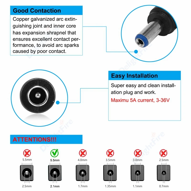 100% новый разъем питания постоянного тока (Жен.): 5,5 мм * 2,1 мм (Муж.): 5,5*2,5 мм Материал проводника: цинковый сплав Изоляционный материал: пластикПосылка включает в себя: