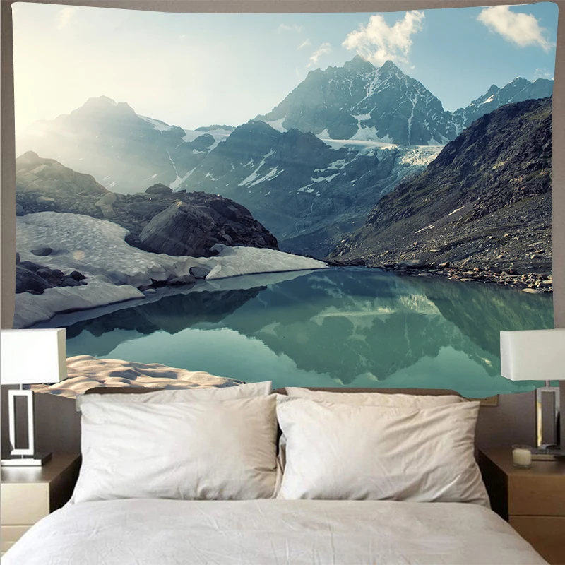 Дешевые горы Голубое озеро гобелен настенный подвесной пейзаж зеленый луг художественная настенная ткань Тонкий Потолочный декор одеяло фон