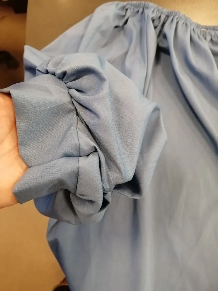 Двоякие впечатление о блузке. По фотографиям цвет должен был быть серо синим, по факту он синий. Ткань хоть и синтетическая, но приятная, плотная. На ОГ 90 заказала м, села хорошо. Задумка с рукавами интересная, но исполнение так себе, действительно защипы сделаны не очень красиво, но можно исправить, пришив какие то бусинки или тп. Манжет великоват, если подтянуть рукав, то он не держится, но опять таки можно что то придумать. С продавцом не общалась, товар отправили быстро, пришёл недели за 3. Продавец положил подарочек--резинку, за что спасибо)