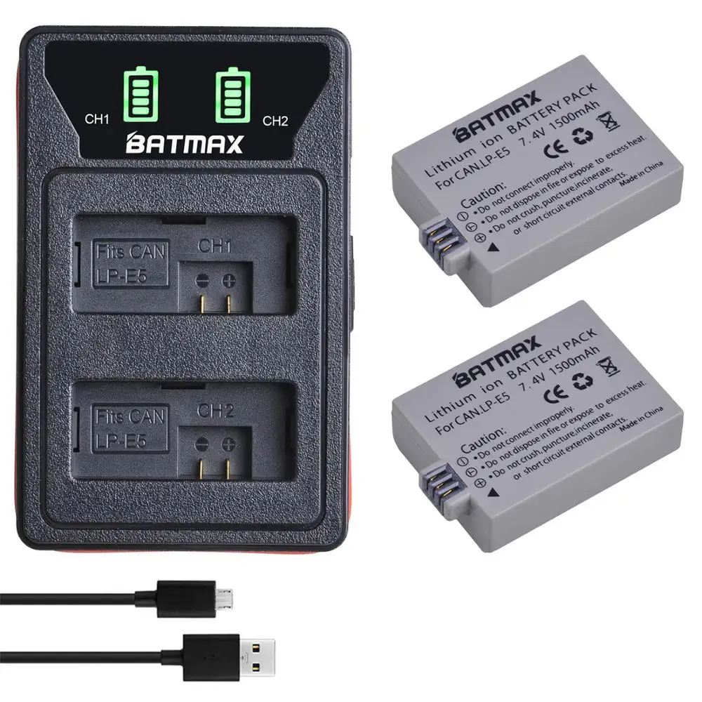 Аккумулятор LP E5 2 шт. 1500 мАч + встроенное зарядное устройство USB со светодиодной подсветкой для Canon EOS Rebel XS,Rebel T1i,Rebel XSi 1000D 450D,Kiss X3,X2,F