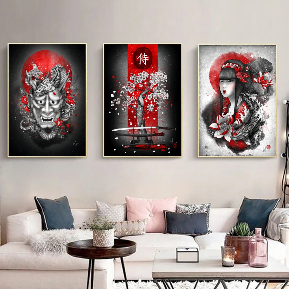 Японские гейши и Инь-Янь, картина маслом на холсте, настенный художественный постер и принты, картина самурая для украшения гостиной