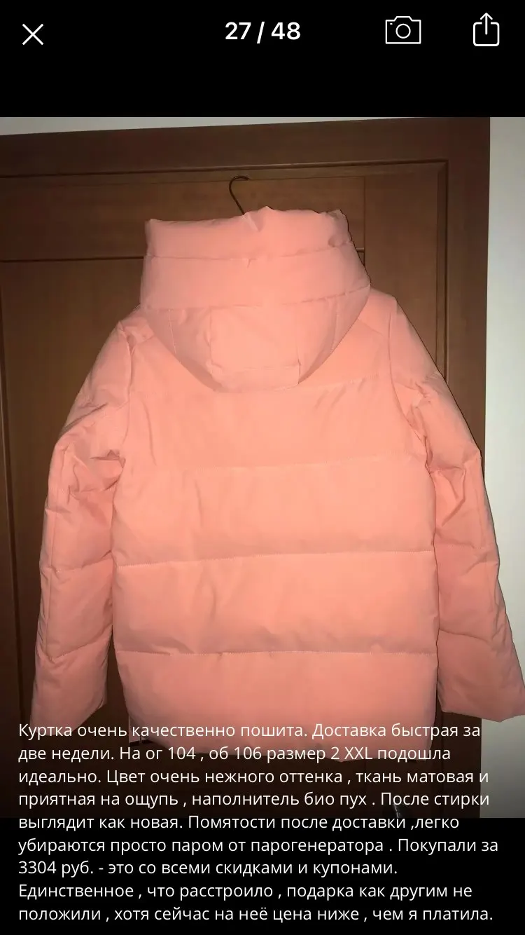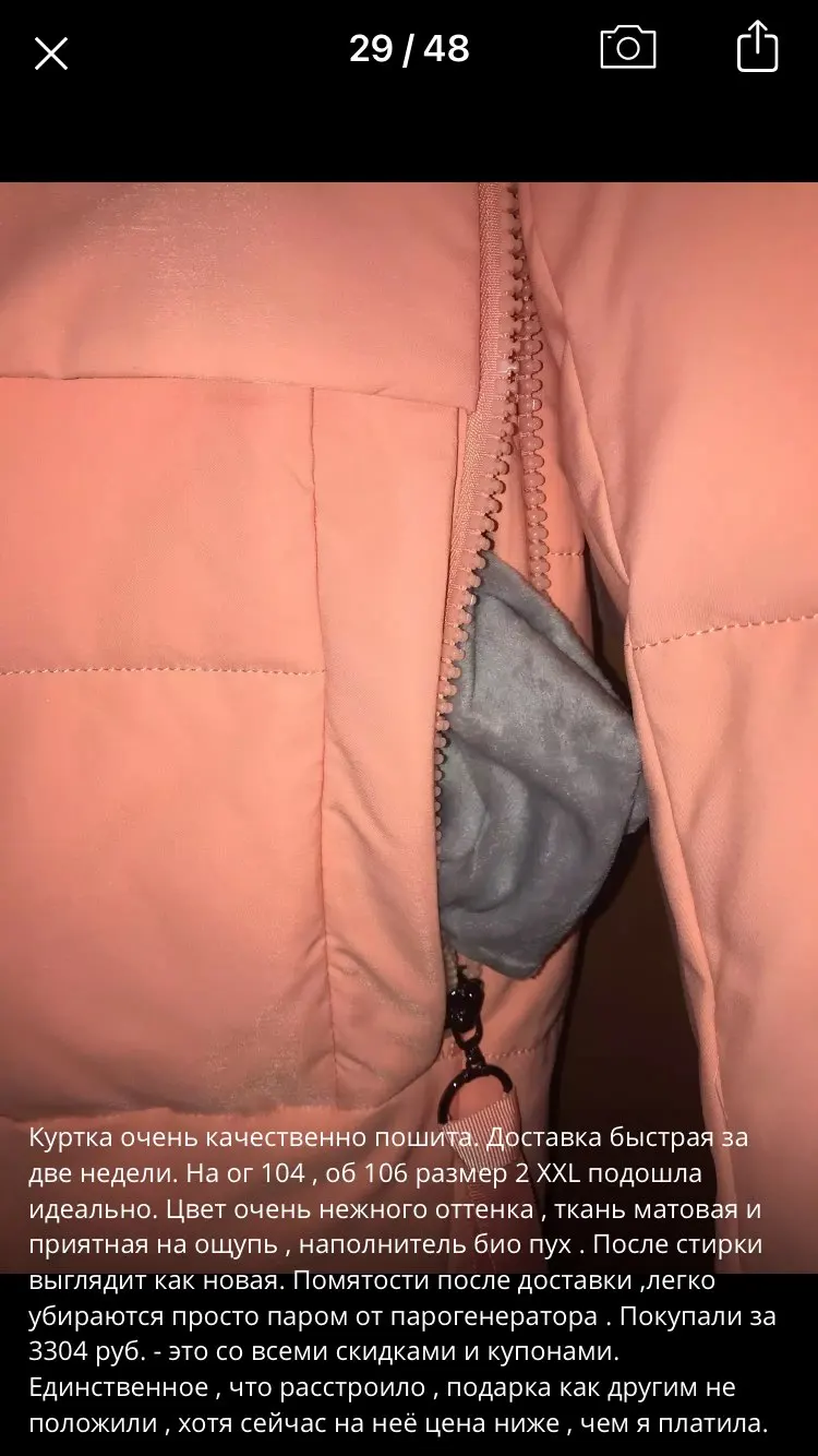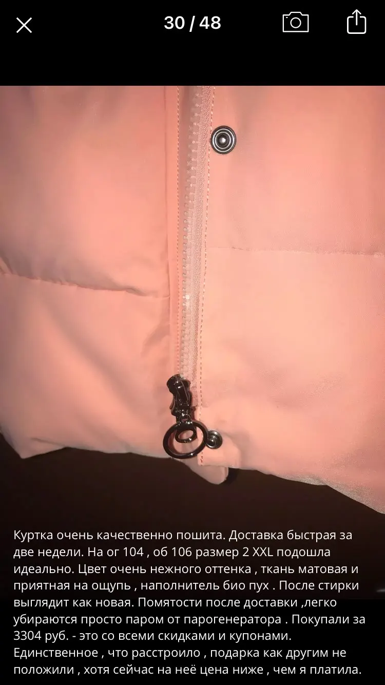 Куртка отличная. На 50-52 подошла, как тут и была. Пошито качественно, цвет, как на фото, ткань верха очень приятная, нежная не шуршащая. Я очень довольна. Спасибо большое продавцу и за куртку и за подарочек, желтенький шарфик. Удачи. Советую продавца.