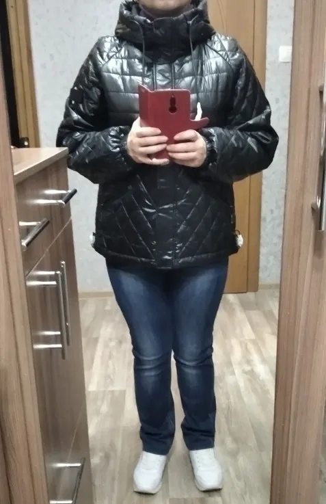 Курточкой очень довольна.Легкая,мягонькая,ткань выглядит интересно,как-то поблескивает,тонкая.Наверно,не стоит зацепляться ,не выдержит даже маленькой зацепки.Кажется,очень теплая.Модель короткая,брала на раннюю осень или весну,подходит к любым брючкам.На рост168,100-110 размер2XLсидит свободно,но меньше-будут короткие рукава.В общем,мне очень нравится.