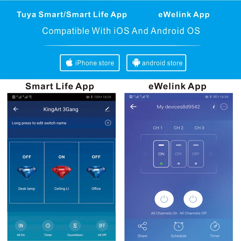 Пользователь может использовать смартфон для удаленного управления домашней электроникой в любое время, если телефон имеет сеть 2G / 3G /4G/Wi-Fi, совместимая с операционной системой iOS и Android с eWeLink/Tuya