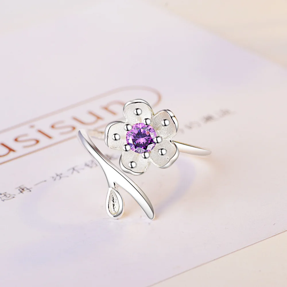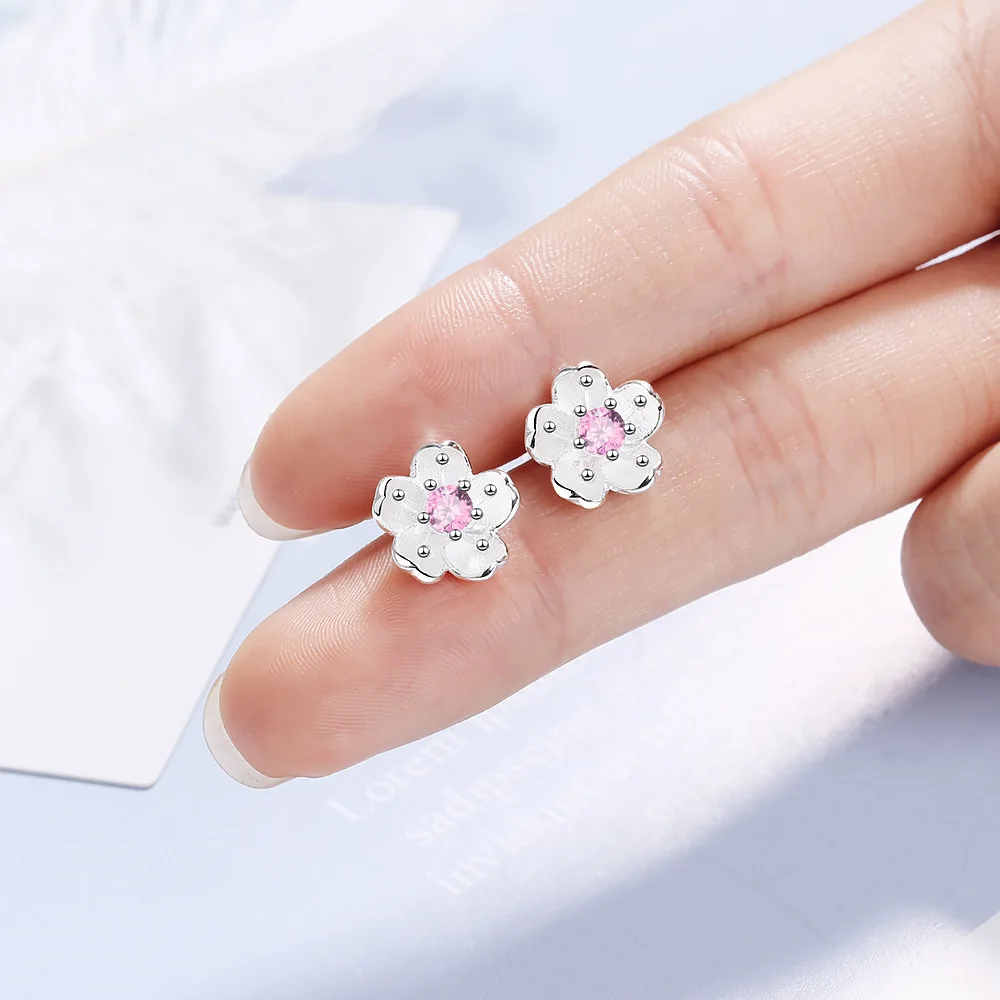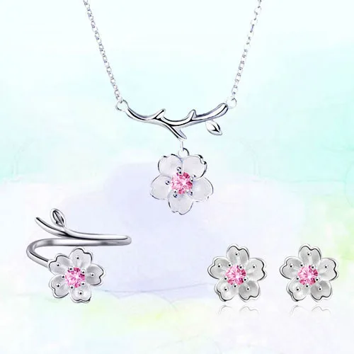 Женский свадебный комплект ювелирных изделий из стерлингового серебра 925 пробы с розовыми кристаллами и цветком вишни, серьги, кольца для женщин, 2019